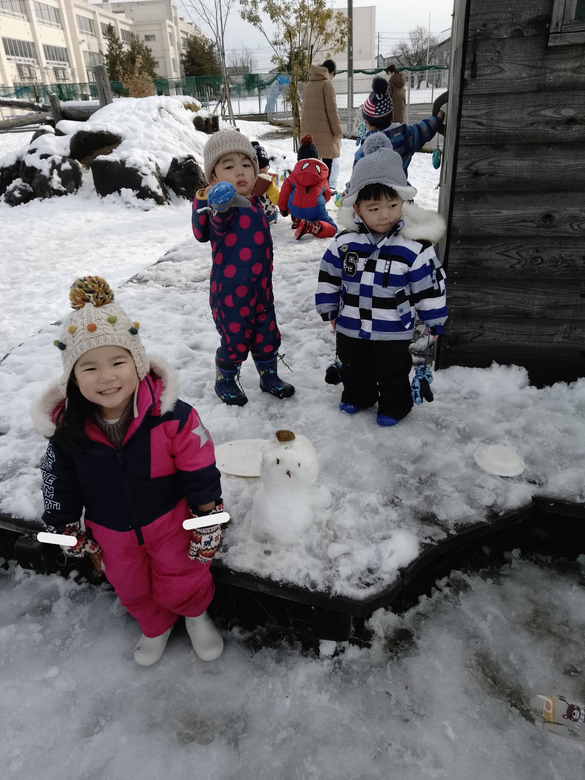 新しい年を迎え、2週間が過ぎました。年末年始の休み明けから、元気に登園してくる姿が多かった子どもたちは、この時季ならではの遊びを思いきり楽しんで過ごしています! 雪遊び 雪が降