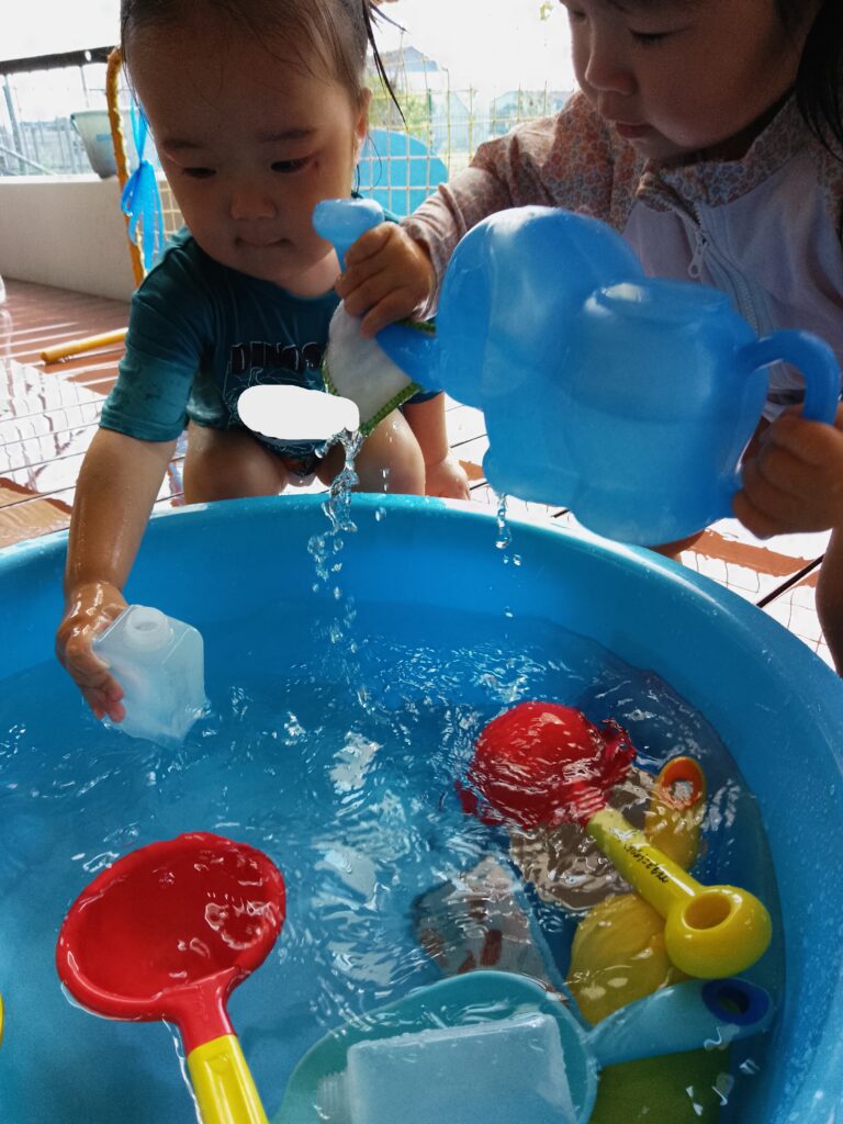 水遊びではたらいの中の水をスコップですくったり、ジョウロで掛け合ったり・・・