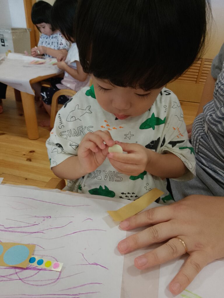 小さいサイズのシールに苦戦する様子もありましたが、できない!とあきらめることなくシールを台紙から剥がすことができました!