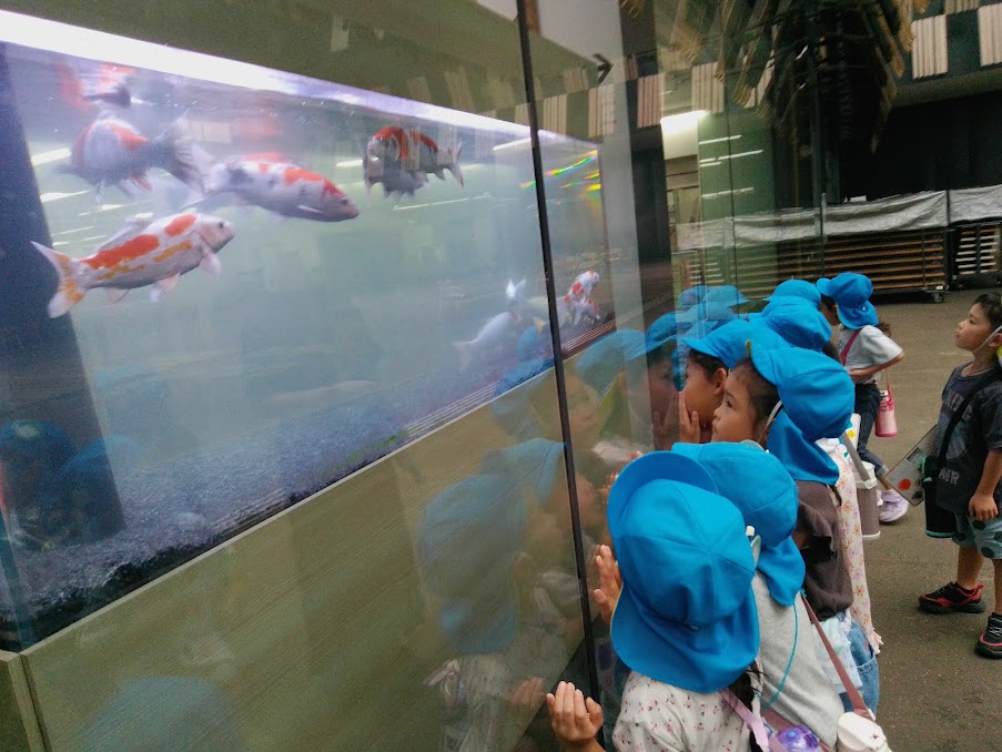 アオーレに鯉がいることを知っている子もいましたが、実際に近くで鯉を見ると「すごいね」「ぬりえでぬった色が入ってる!」などそれぞれの気付きがあったようです。