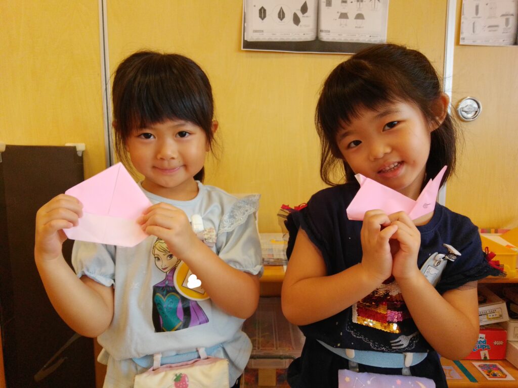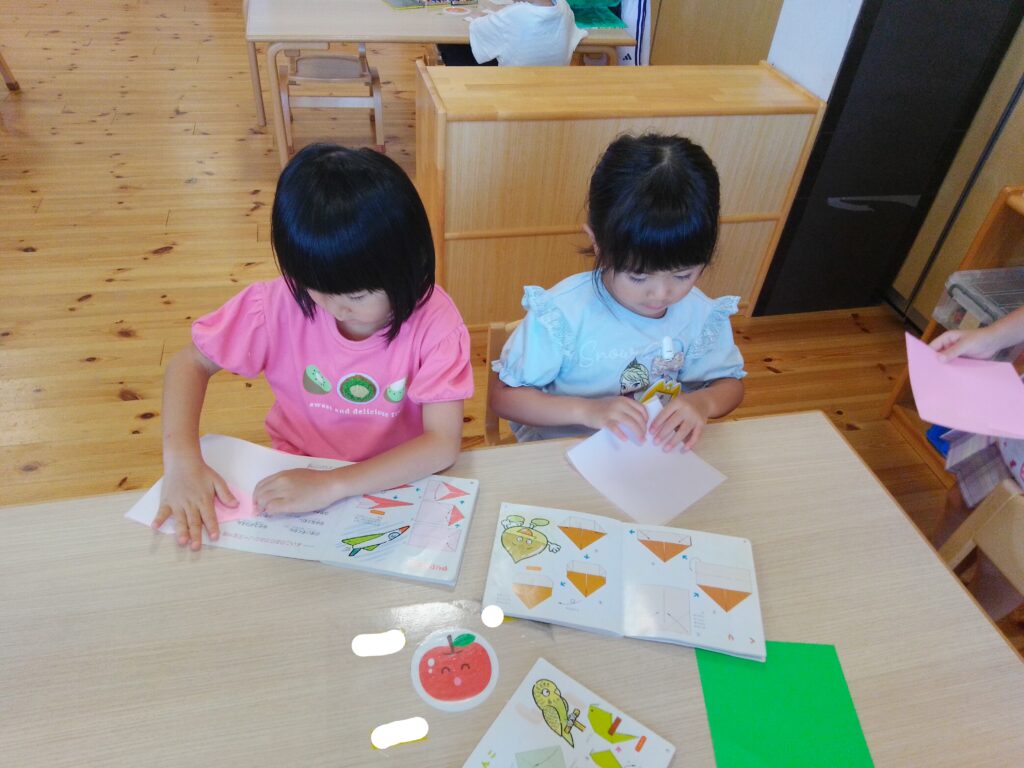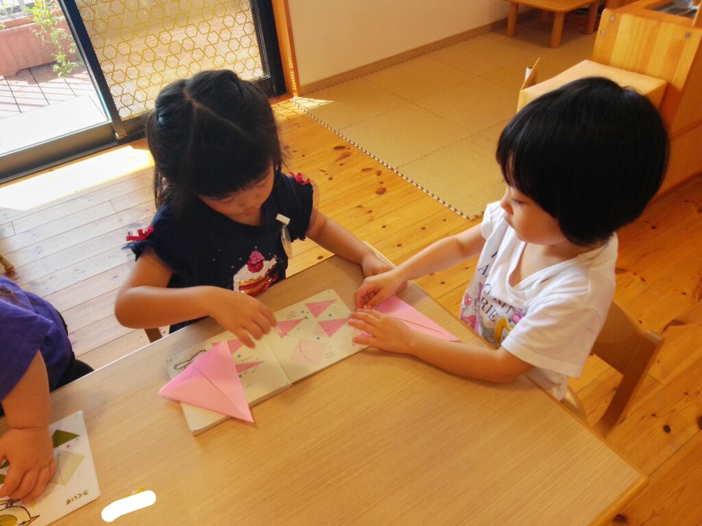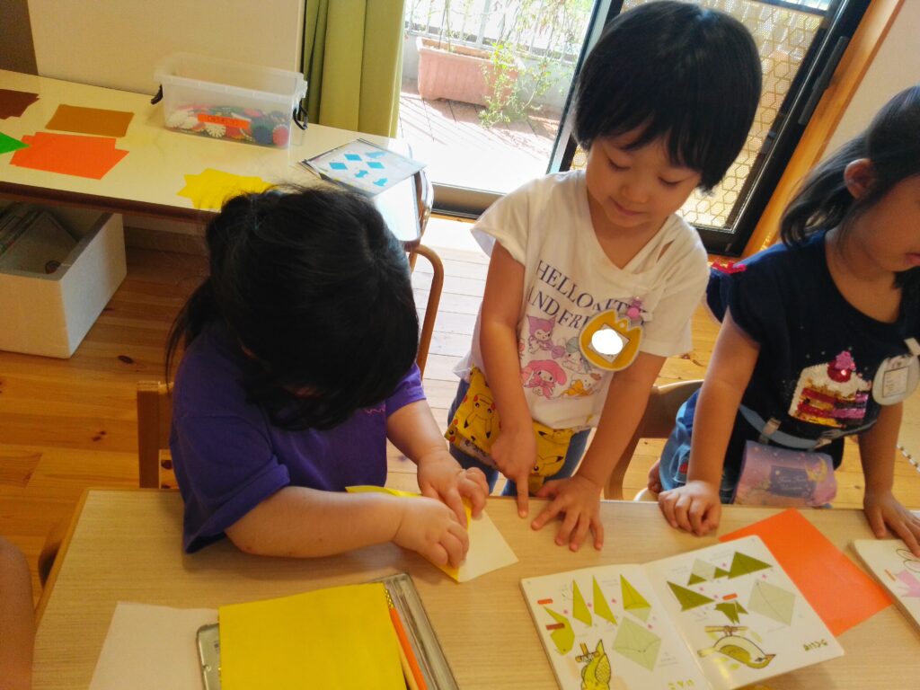 日中は園庭や遊戯室などでたくさん体を動かして遊んでいますが、朝は保育室の中で友達とコーナー遊びを楽しんでいます。最近は折り紙が好きな子が多く、本を見たり友達や保育者に教えてもらいながらいろいろなものを作って遊んでいます。