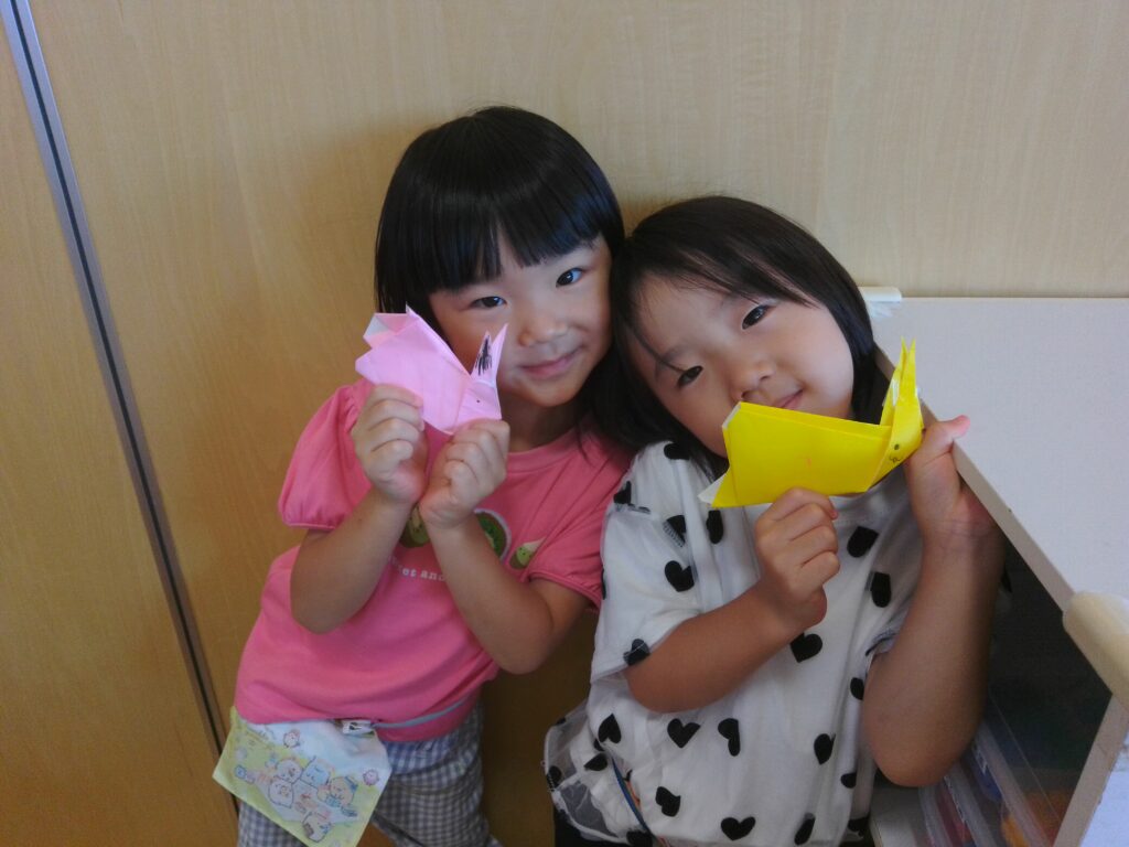 子どもたちが作った折り紙を保育室の壁に貼ってみると、「これ○○ちゃんのだ!」と友達と嬉しそうに見せ合っていましたよ!