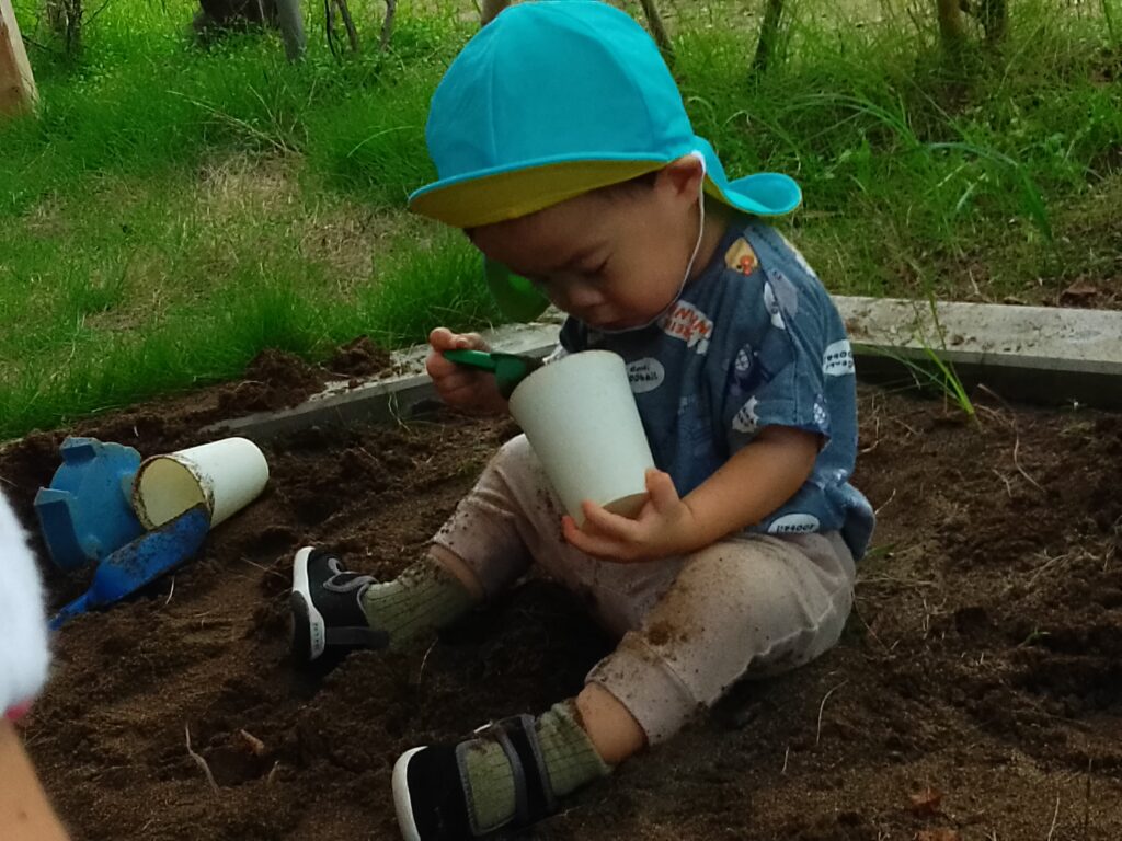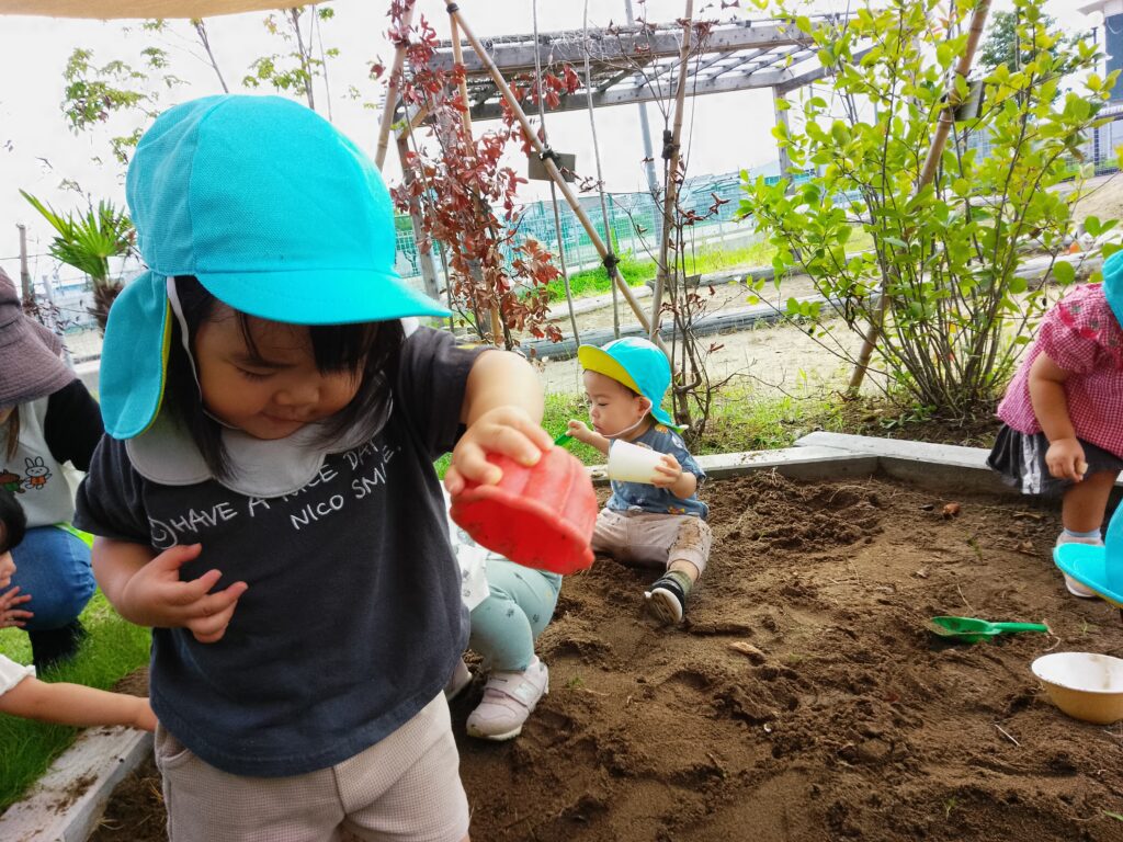 砂場では、コップやバケツに砂を入れてケーキやプリンに見立てて遊ぶ姿や、食器を並べておままごとをして楽しむ姿が見られました!沢山ケーキやプリンを作ってくれました。