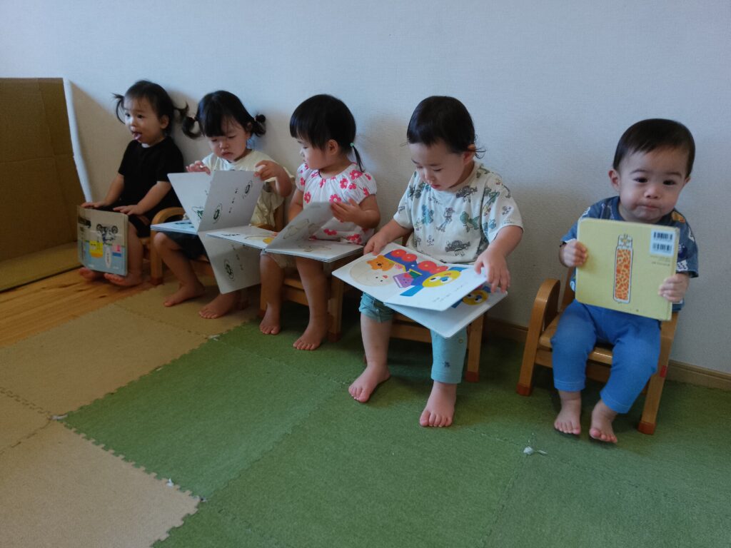 横一列に並んで絵本を読む姿や、フラフープで電車ごっこを楽しむ姿など様々な遊びの場面で仲睦まじい子どもたちの様子を見て私たちも日々笑顔になっています。