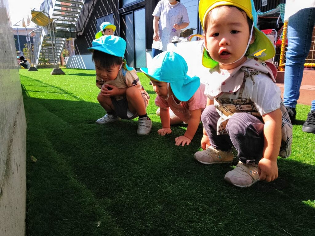 また、ミニ園庭では、草むらにカエルや虫がたくさんいて、友だちと一緒に探したり、追いかけたりして楽しんでいました。虫を見つけると友だちや保育者に「いたよ!」と嬉しそうに教えに来てくれました。フェンスの前に腰を掛け、「あったかいね~」とみんなで日向ぼっこをする姿も見られ微笑ましかったです!