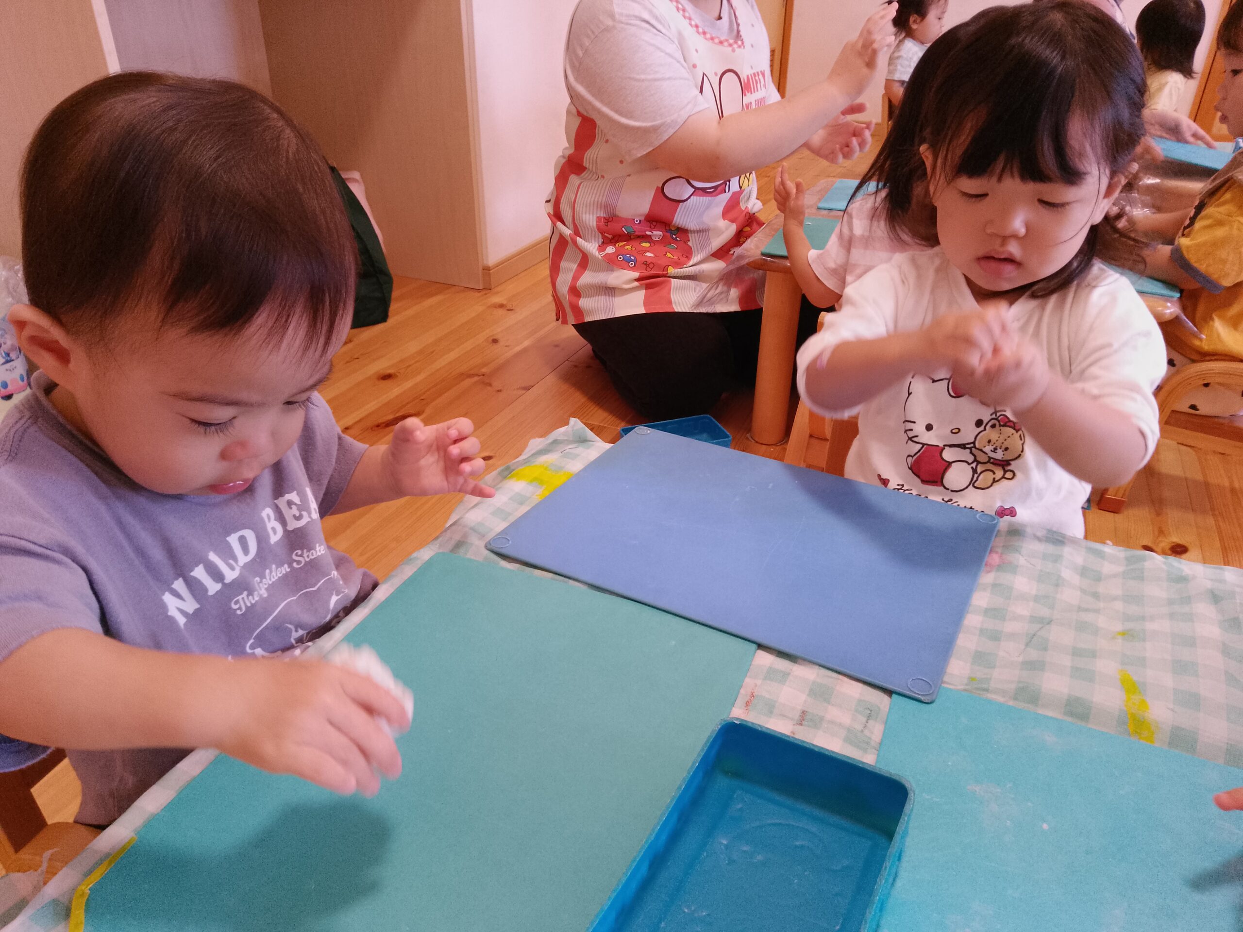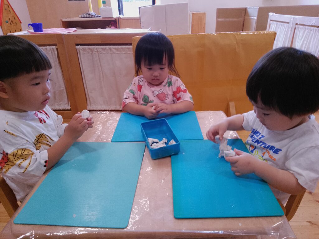 晴れた日は園庭やテラス、散歩などに出かけ戸外遊びを存分に楽しみました。天気が優れない日も多くありましたが、そんな日は室内で粘土遊びや机上遊びをしてゆったりと過ごしました☺