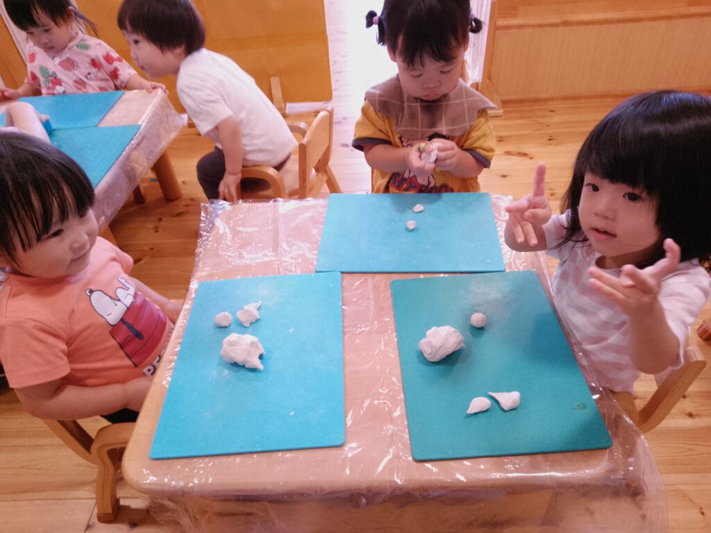 保育者がお手本を見せ、フルーツや動物、キャラクターなどの形を作ると大喜び✨