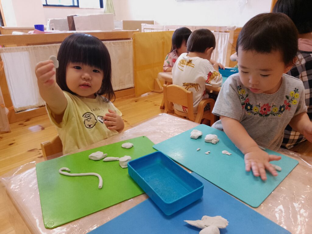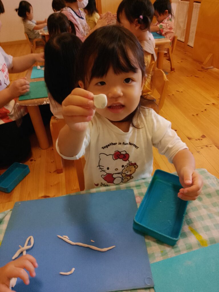 ちぎったり、手のひらで丸めたり、コロコロと転がして少しずつ伸ばし、ヘビのような形を作ったり…!