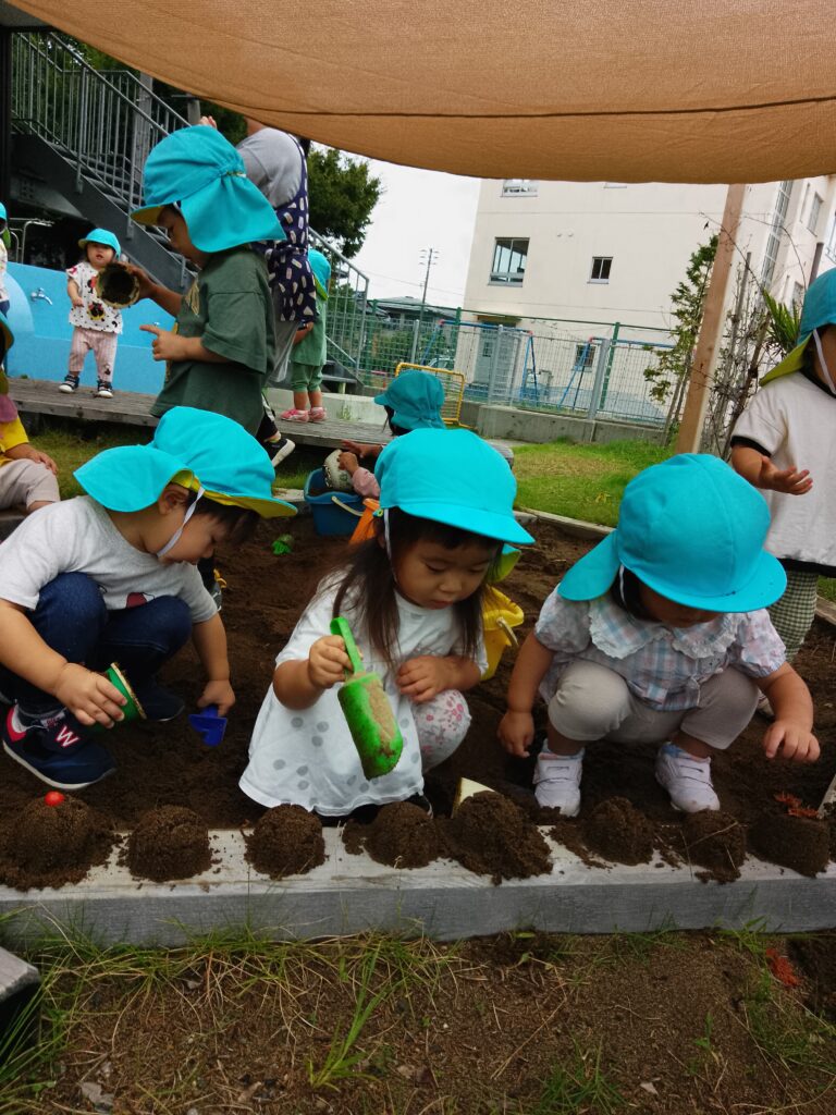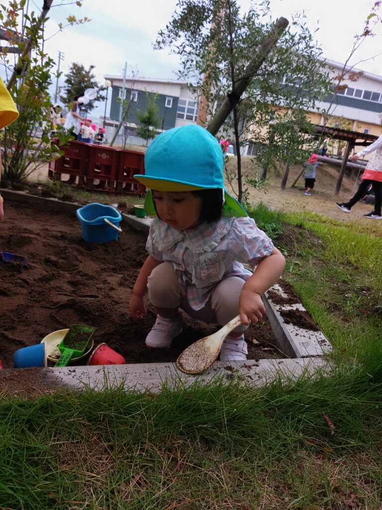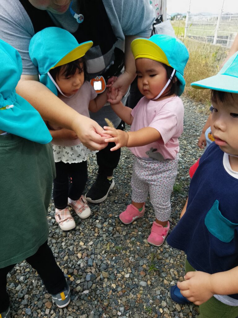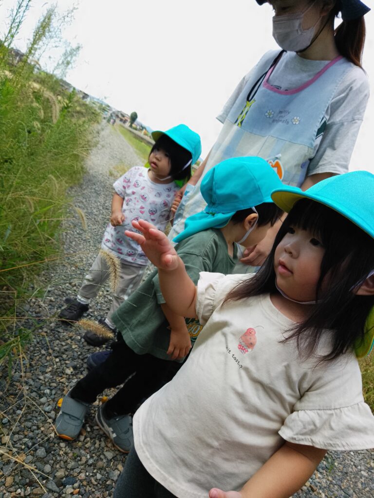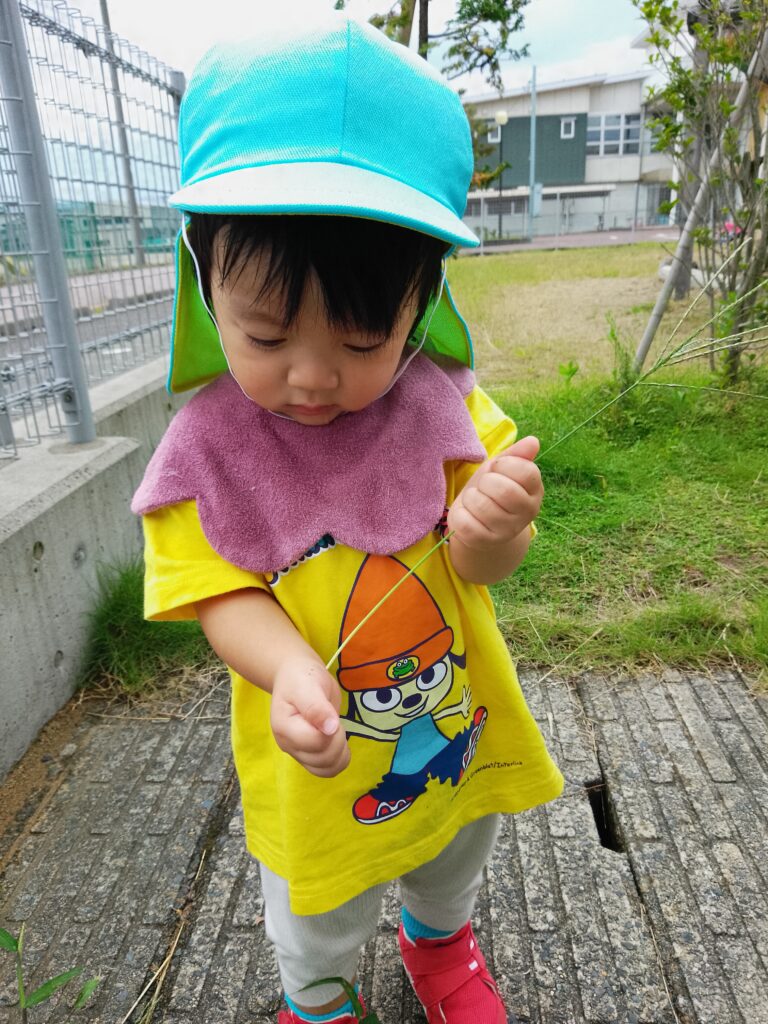 春の頃と比べると体力もつき、活動の幅もぐっと広がりました。芝のミニ園庭を駆け回ったり、園の周りをお散歩したりしながら、とんぼやかえる、ねこじゃらしなど、身近な秋の自然に触れ合い、面白さや不思議さを見つけています😊