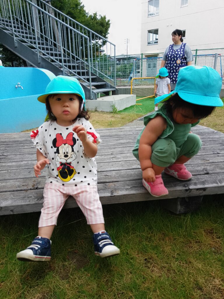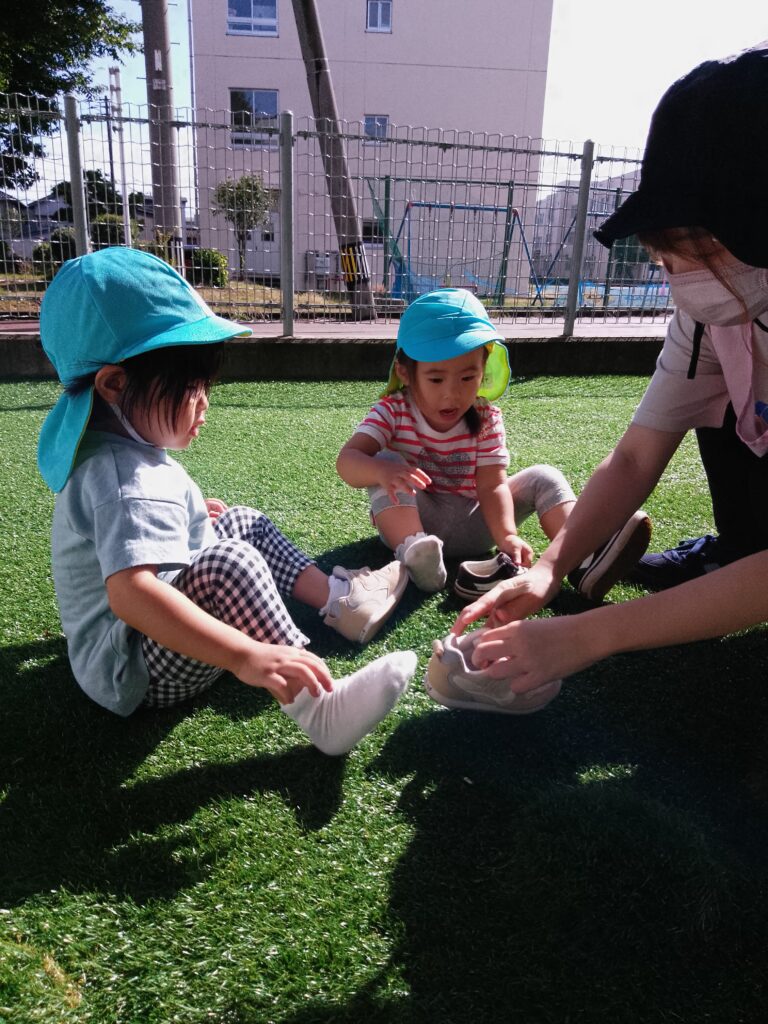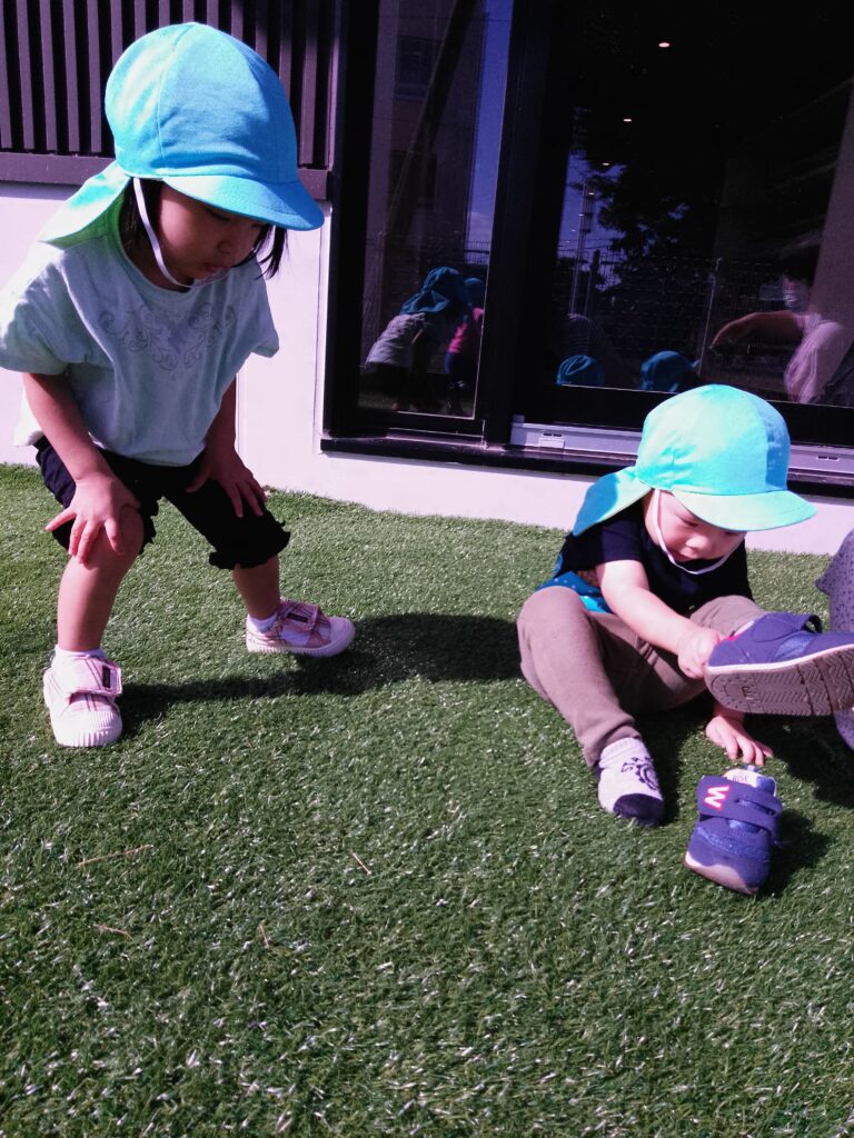 身の回りのことにも、少しずつ挑戦している子どもたち。大好きなお外に行く前には、靴下や靴、帽子と準備もたくさん!まだまだ難しい所もありますが、保育者と一緒に頑張ってみたり、手足をたくさん動かし最後まで頑張ってみたりと、頑張る気持ち・できる喜びをたくさん見つけていますよ😊