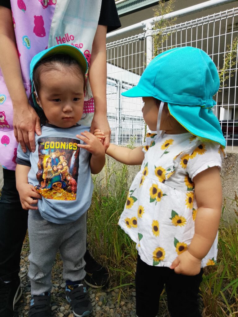 遊びの幅が広がると共に、お友だちとの関わりもぐんと増え、散歩の途中で草花や虫を見つけると「おいで~!」「○○いたよ!」と嬉しそうに知らせ合い、一緒にじっくり観察🐸同じものを見て・触って・感じて、お友だちと喜びを共有し、気持ちが通じ合う楽しさを見つけています😊