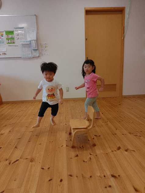 耳をよーく澄ませて、音楽が止まったら椅子に座る!白熱した椅子取り合戦を繰り広げる子供たち。最後の2人まで残ると、みんなが注目して勝敗を見守っていました。