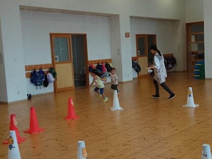 あひる組の時にも遊んだことがあるゲーム。その頃よりも足の速さが増し、なかなかしっぽが取れない!ルールもしっかり覚えていて、しっぽを取られた子は階段に座って見守っていました。