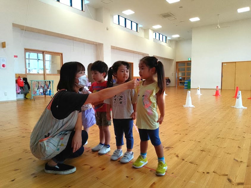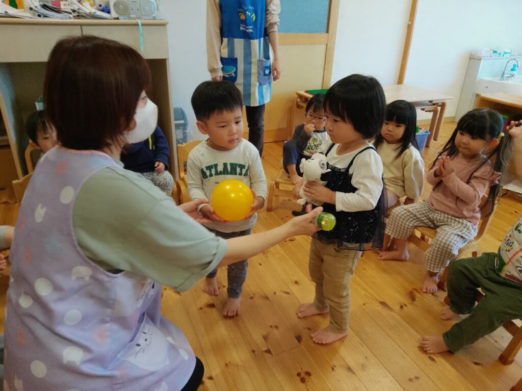 回ってくる爆弾(ボール)にドキドキハラハラする子、抱えてなかなか回さない子と個性が出て面白かったです!最後に爆弾を持っていた子は、みんなの前でインタビュー。自分の名前や好きな物をお話しました。