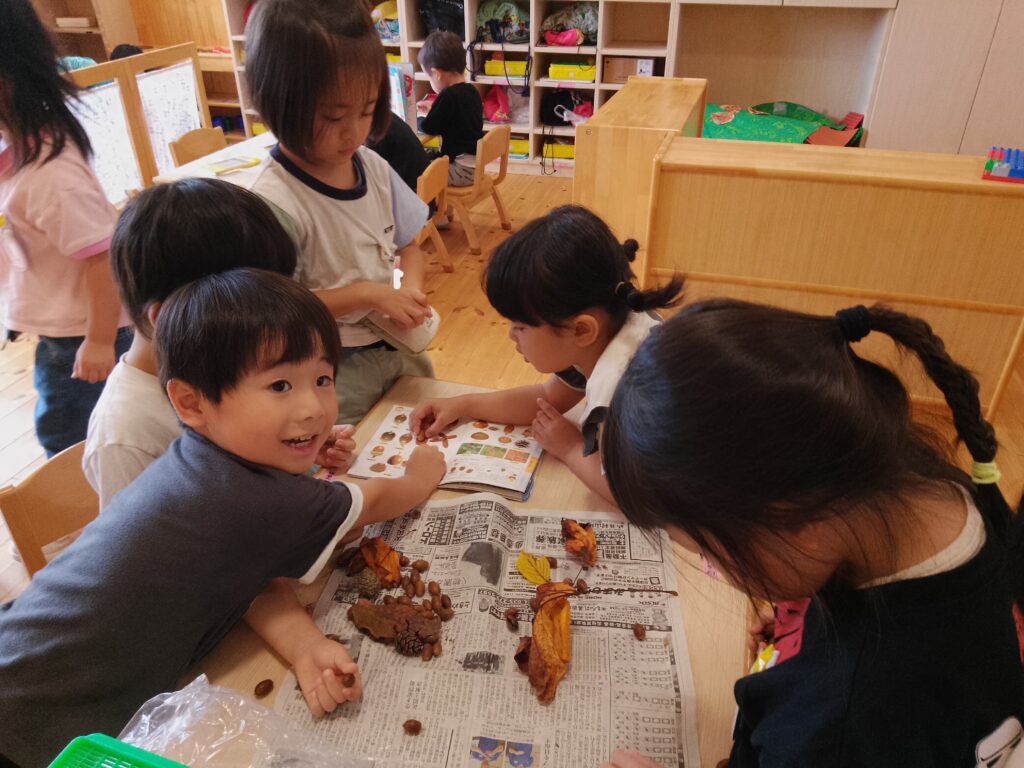 公園で拾ったどんぐりや葉っぱは、お部屋でじっくり観察しています!図鑑を持ってきて同じ大きさのどんぐりか重ね合わせて比べる姿も見られました!