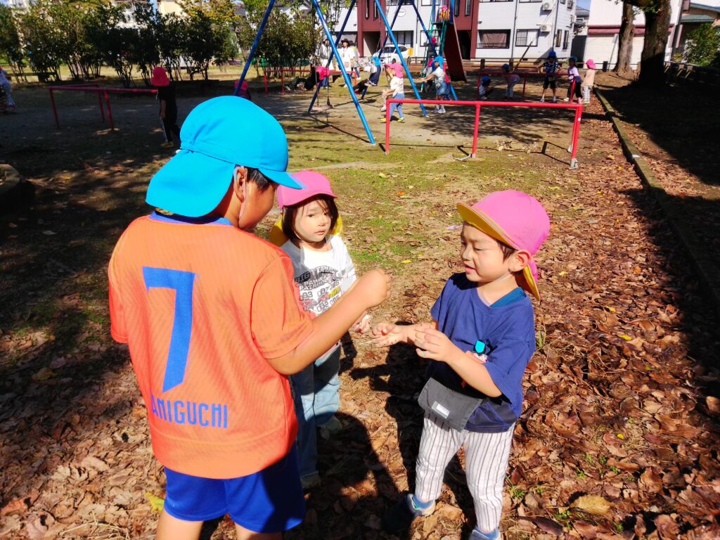 きりん組さんとも高見公園に行くことができ、一緒におにごっこをしたり、ダンゴムシを探したりなど関わりながら遊ぶ姿が見られましたよ✨