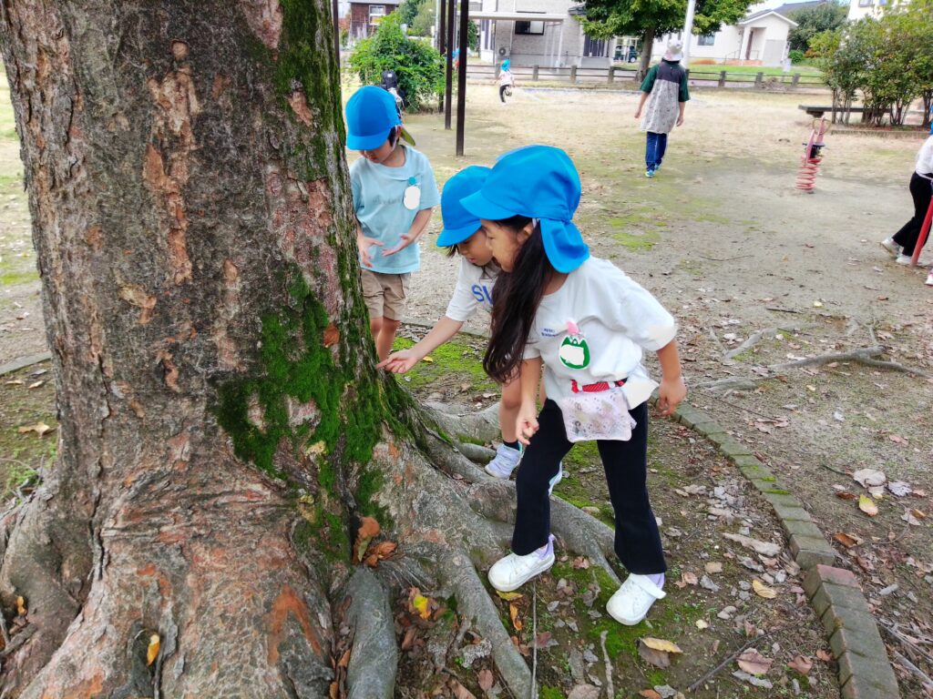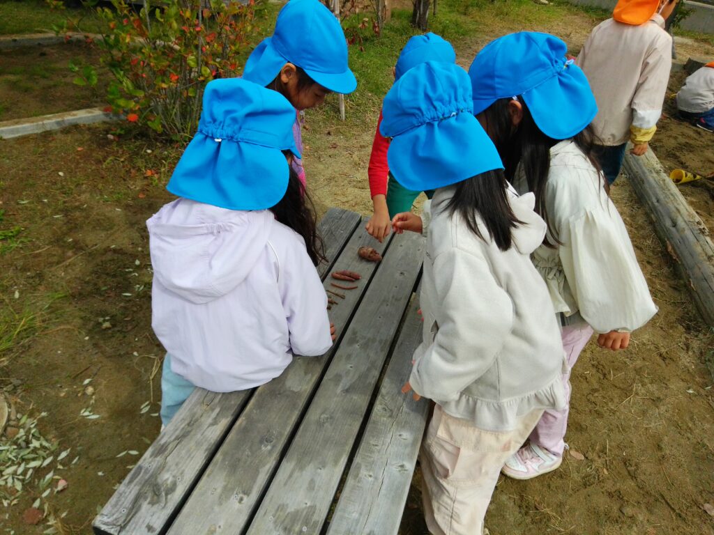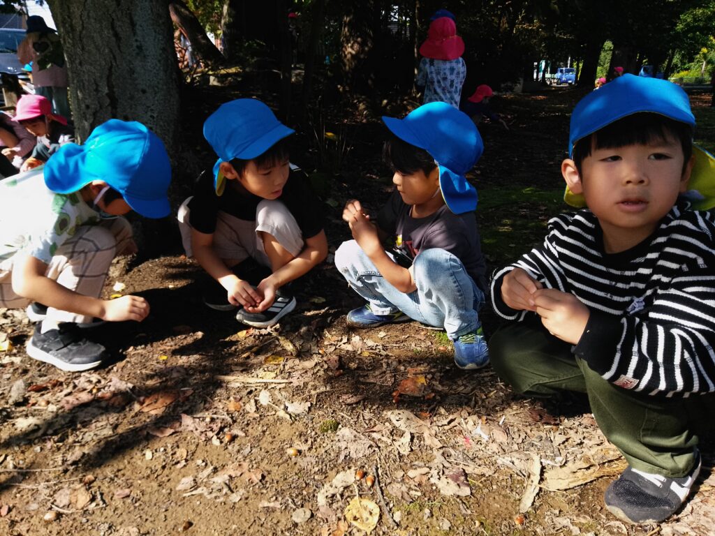 様々な秋の動植物に触れて楽しみながら興味を持っている子どもたち。「知りたい…!」という意欲を大切にしながら季節の遊びを一緒に楽しんでいきたいと思います!