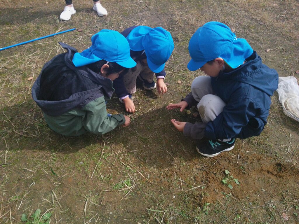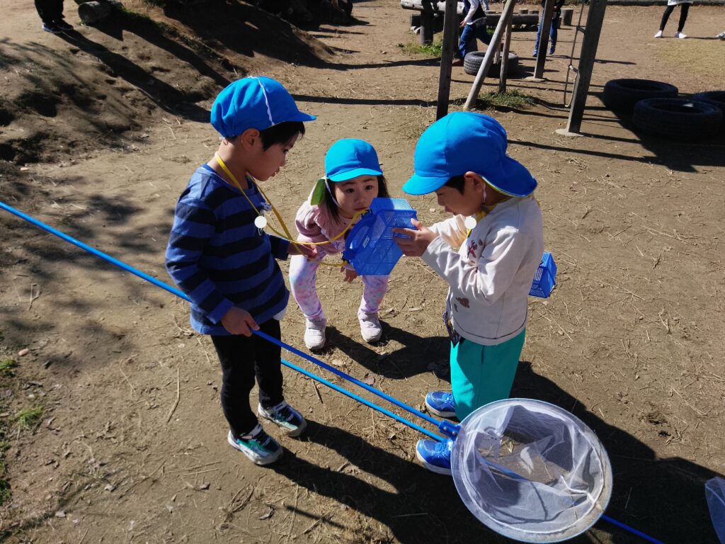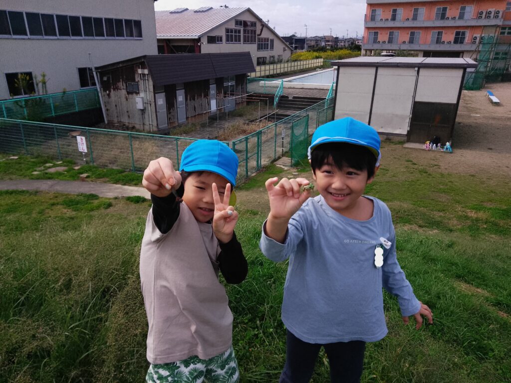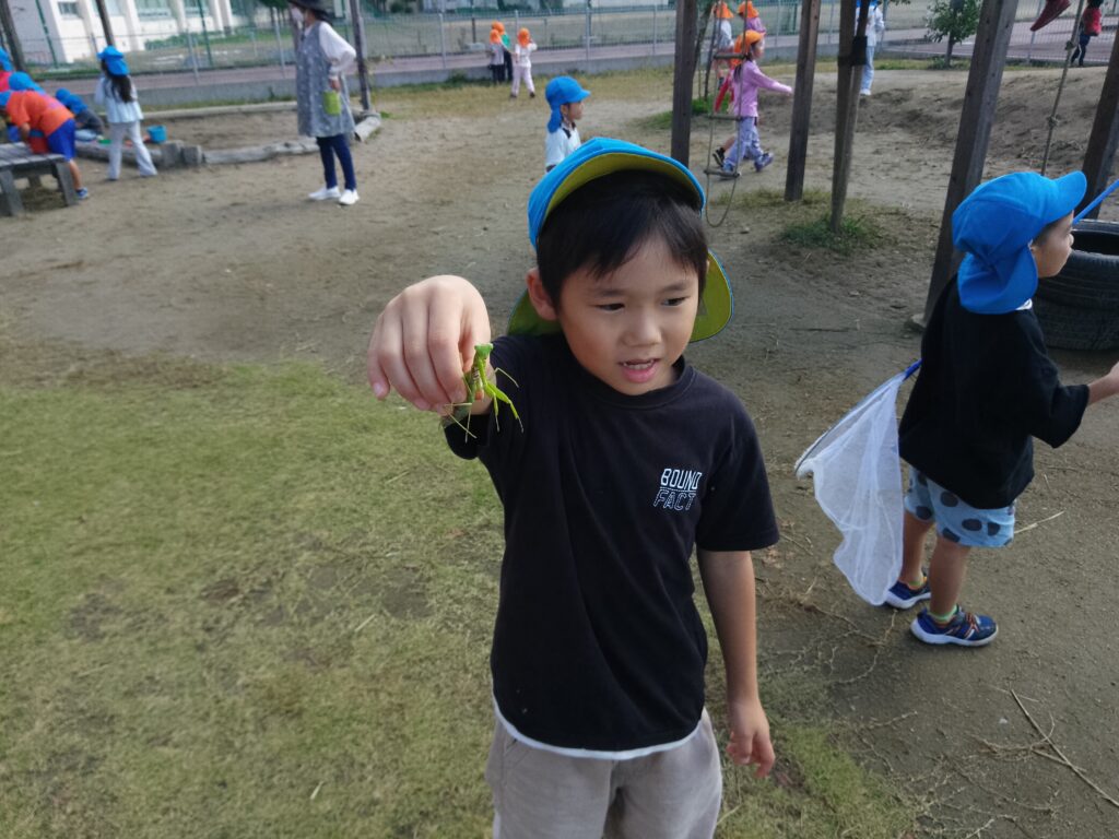 散歩に出掛け、虫捕りやどんぐり、まつぼっくり拾いをしたり、園庭でも虫を探しています。見つけるのも捕まえるのもとても上手になっています!