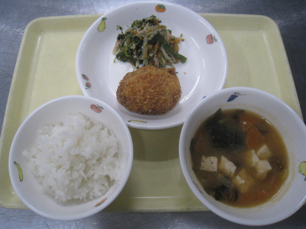 里芋の和風コロッケは、給食室で里芋をつぶして味つけし、パン粉をつけて揚げています。