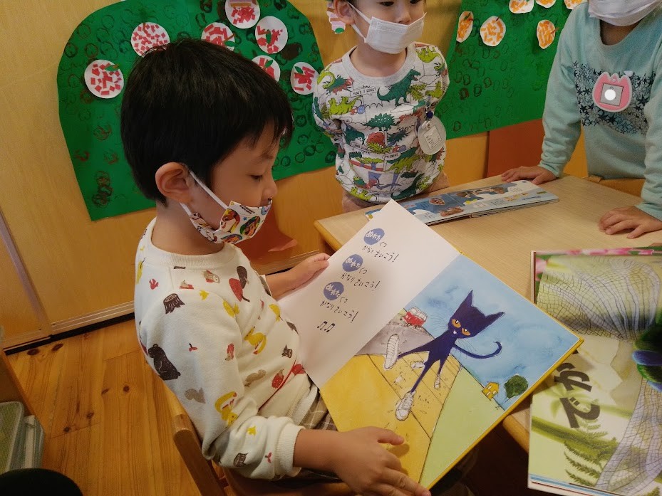 お家で猫を飼っている子の話から、猫が出てくる絵本をたくさん読みました。その中でも、印象が強く残ったこの絵本。最初に読んだ時から、愉快な歌を聞いて口ずさむ子が何人も・・・♪何回も読み聞かせをリクエストするうちに、自分たちでも読めるようになり・・・🥰