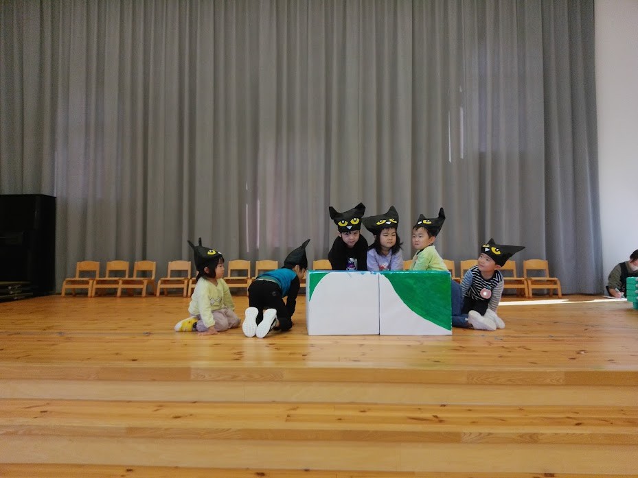 「おでかけしていい?」「山登ってみよう!」と自分たちで伝え合いながら、ページにあった動きを考える姿にびっくり!積み木が欲しい・・・など、遊びの中でしてきたことを取り入れながら、劇ごっこを楽しんでいます♪