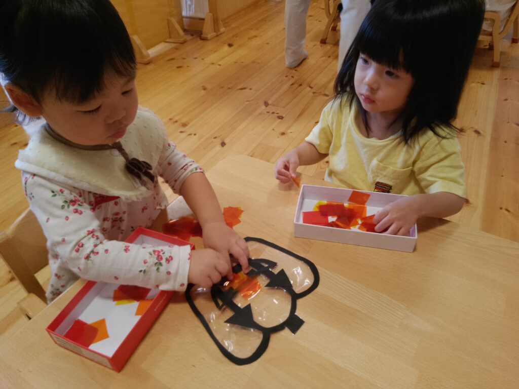 園内から見えるきの葉っぱの色が変わったり、空を飛ぶトンボを目で追いかけたりとお外が気になる子どもたち。戸外遊びや、秋ならではのイベントを楽しみました!