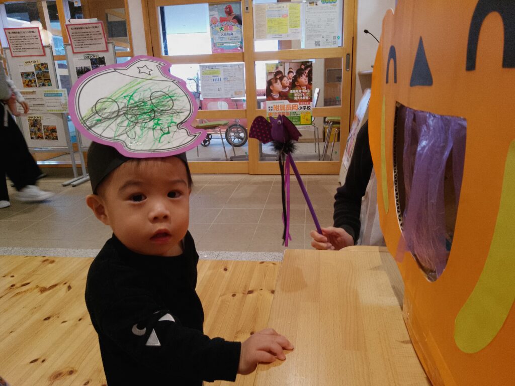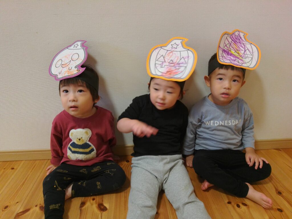 お部屋におばけやかぼちゃの飾りをすると「これなに?」と興味津々!ジャックオランタンやおばけの造形あそびを楽しみ、仮装しておやつをもらいに行きました!