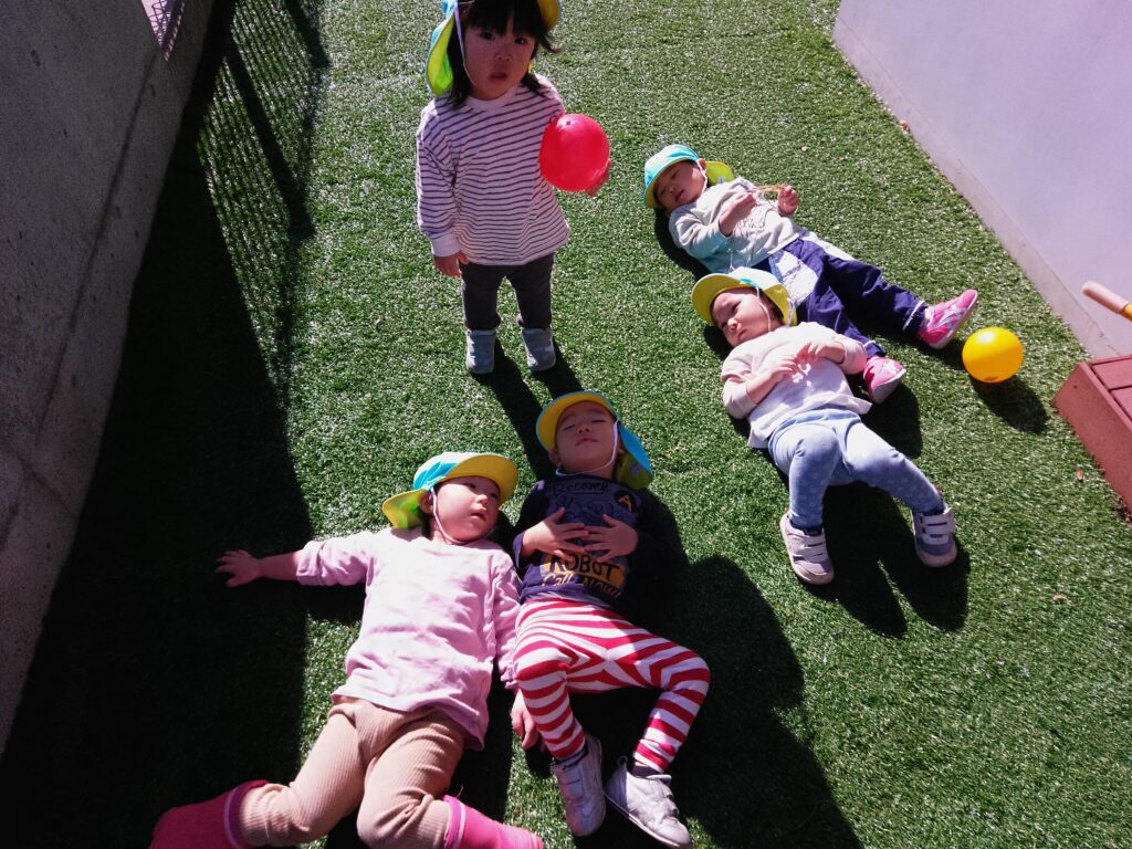 日差しが温かくて日向ぼっこをしている子どもたちです。