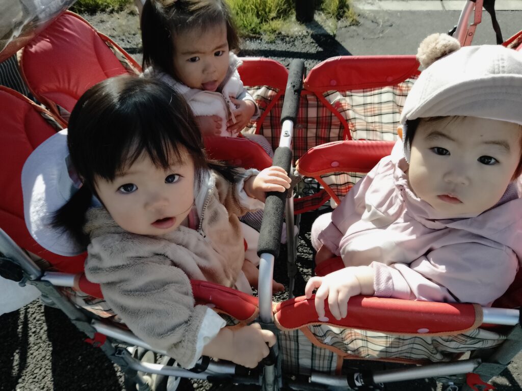 座る散歩カートと立ち乗り散歩カート、どちらも大人気!「乗りたい」と手を広げて待っている子ども達です。