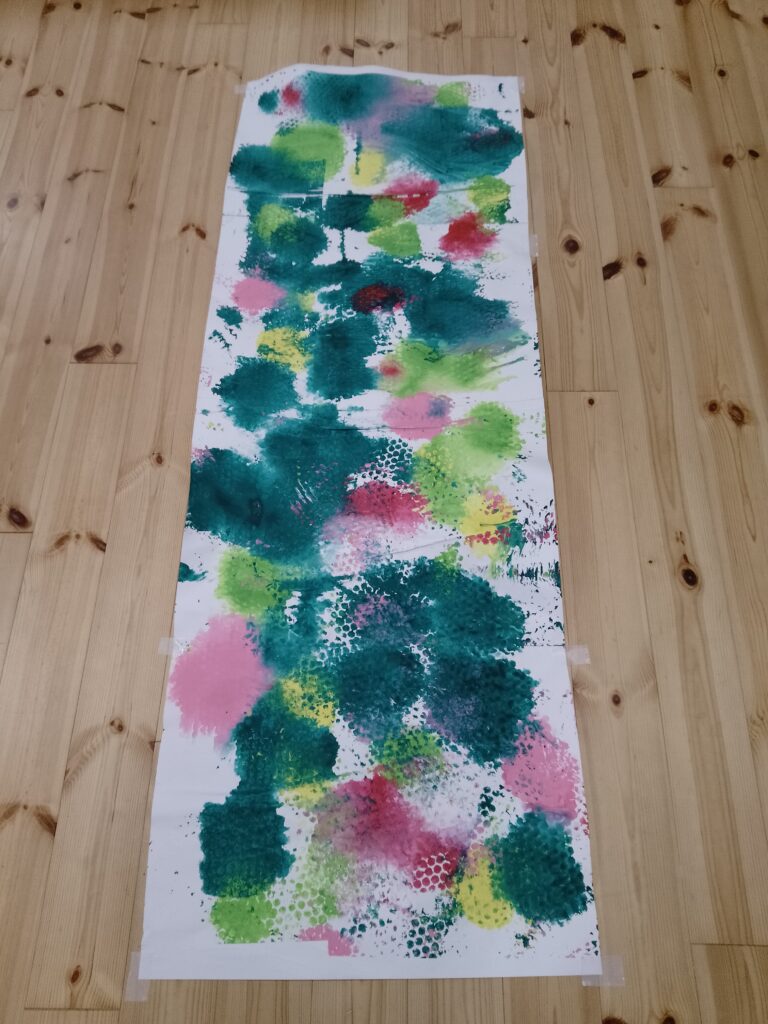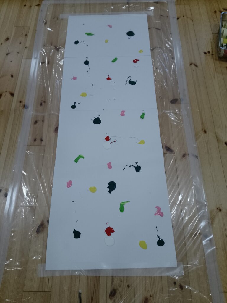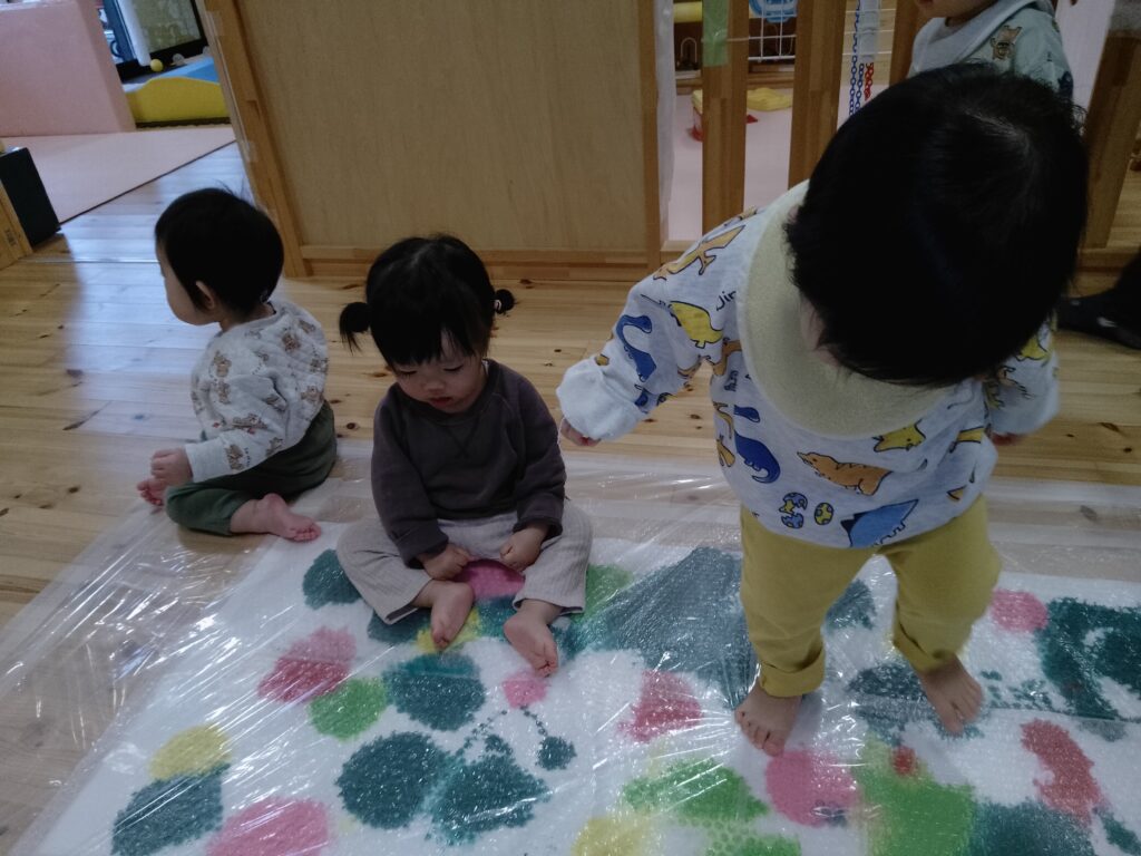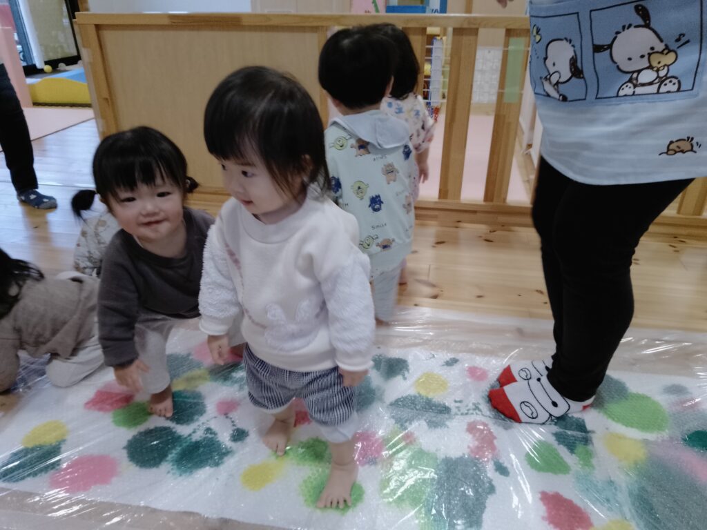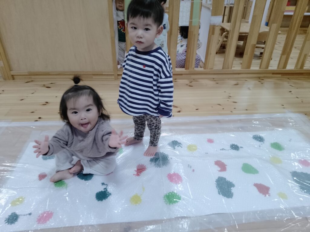 感触遊びをしました。まずは画用紙の上に絵の具をつけて・・・その上にプチプチシートを載せて・・・足でふみふみ👣ちなみに右側は出来上がりです。