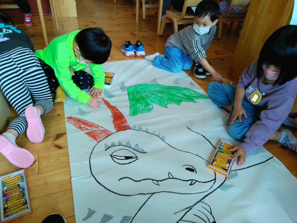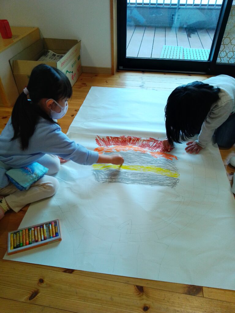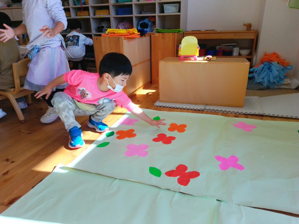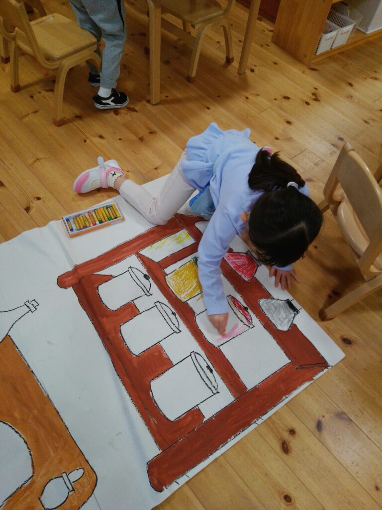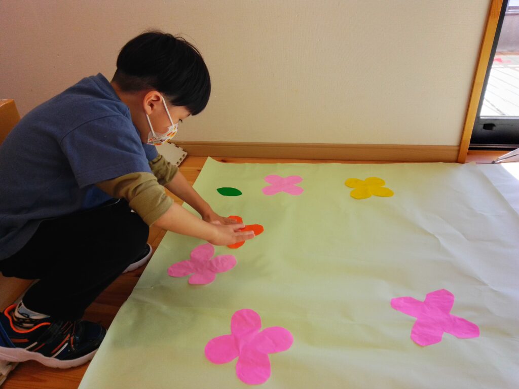 物語に出てくる風景をクレヨンや絵の具でぬりました。お花畑はみんなで折り紙でお花を作って貼りました。