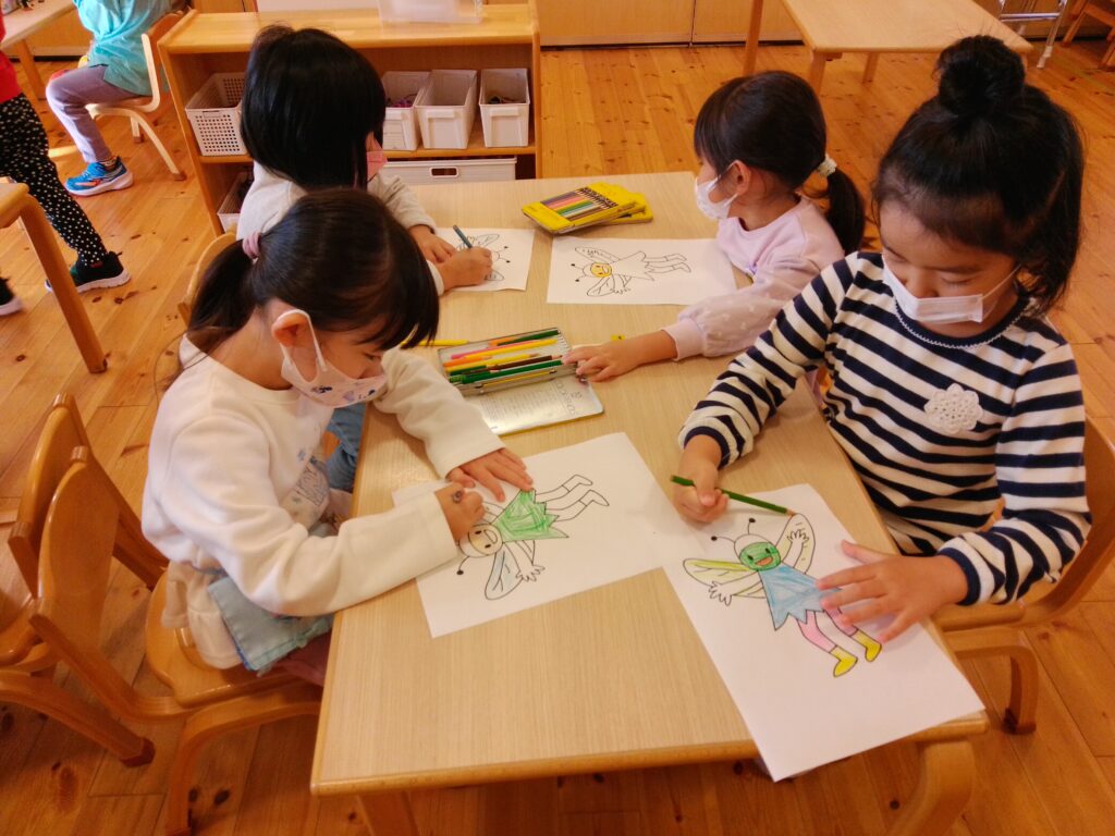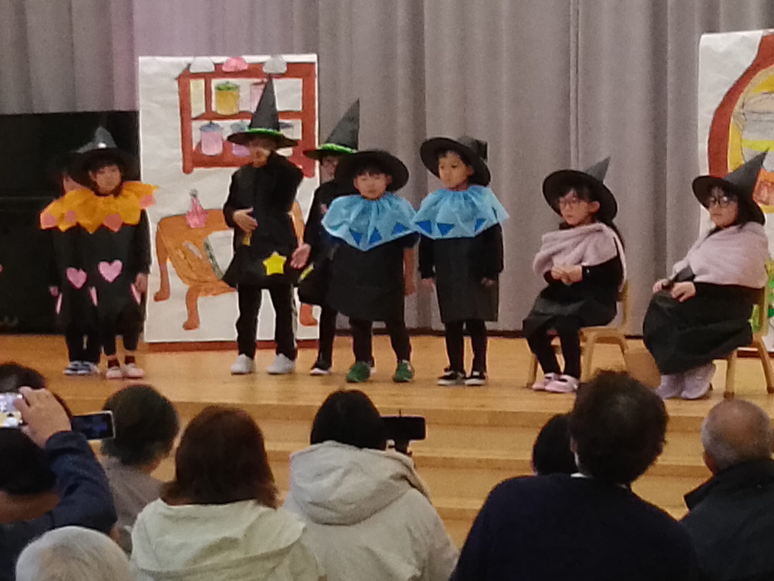 ステージで何度か行うと大きな声も出るようになり、衣装を着ると役になりきって楽しむことができました。祖父母お招き会や発表会ではお家の人の前で発表。上手にできてほめていただき、自信がついて一回り成長したようです。これからもいろいろな絵本を楽しんでいきたいと思います。