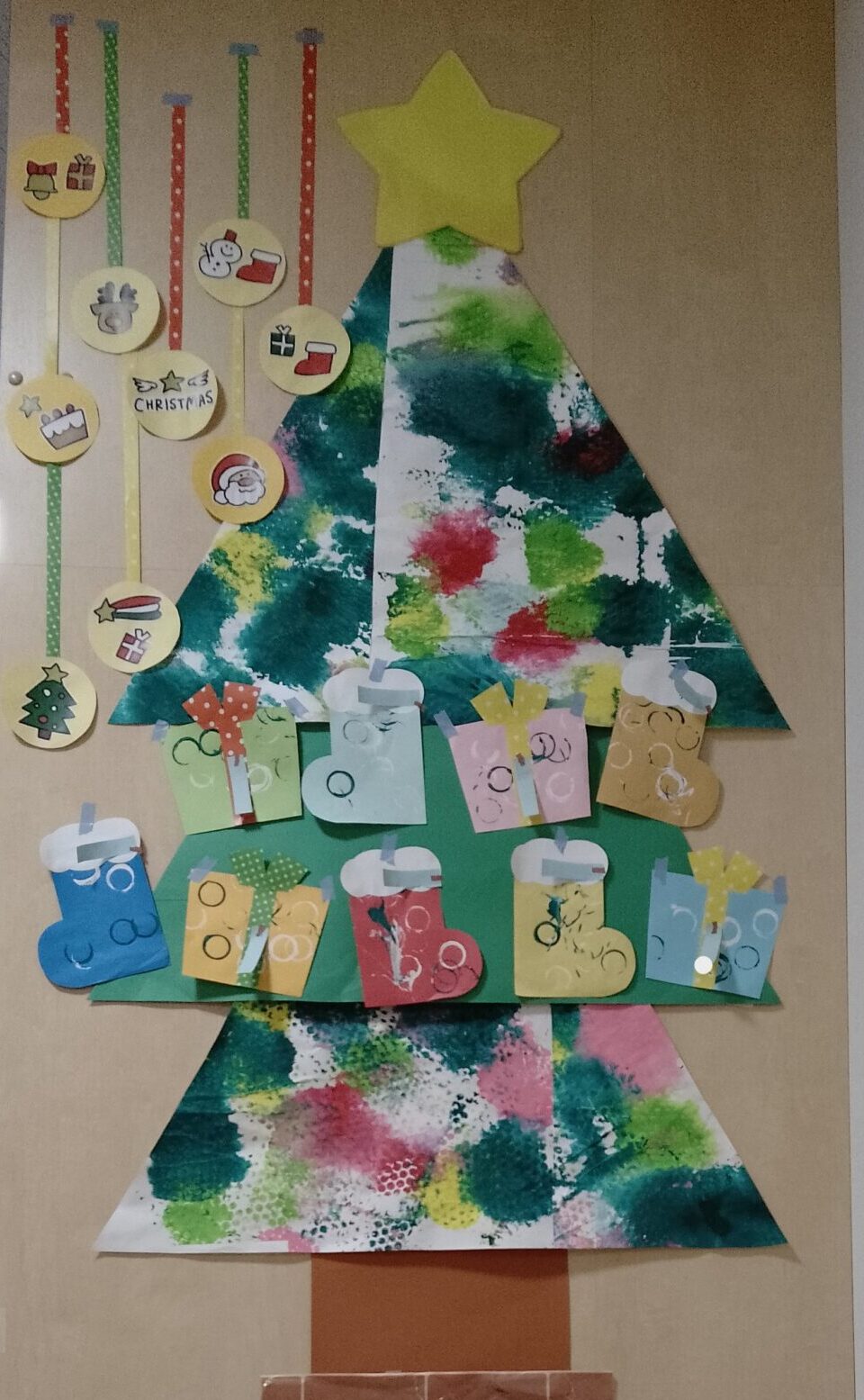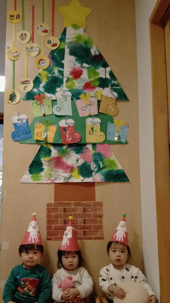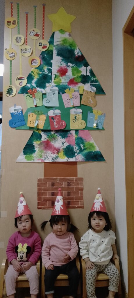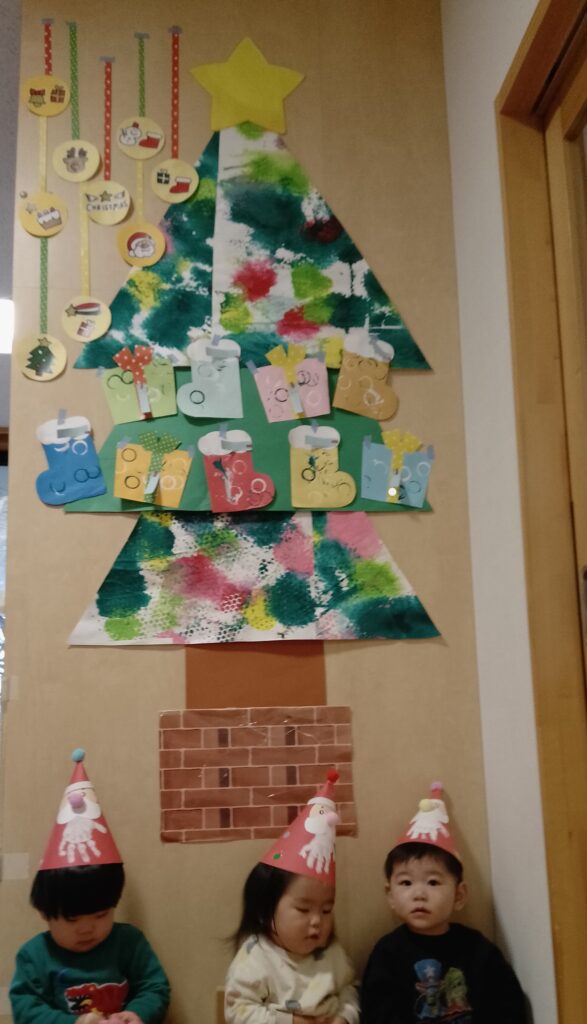 クリスマスツリーでした!🌲🔔自分が作った飾りを見つけにっこり嬉しそうにしたり、朝登園のときにお母さんお父さんに「見てみて~!」とツリーを指差し伝えたりと可愛らしい姿があります!
