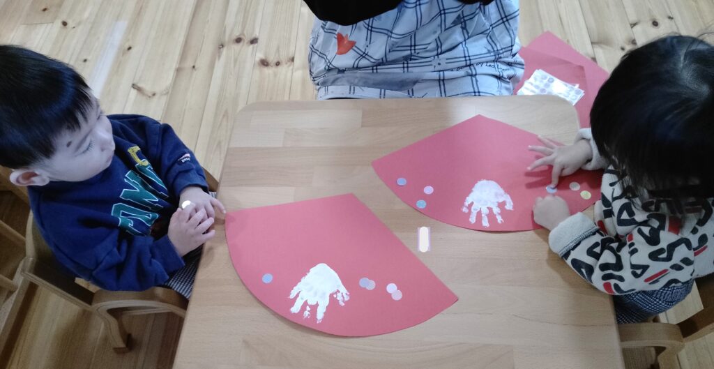 長靴とプレゼントの画用紙に夢中でスタンプをする子どもたち。素敵なクリスマスツリーの飾りが完成しました!また、赤い帽子ではみんなの手形がサンタさんに大変身✨