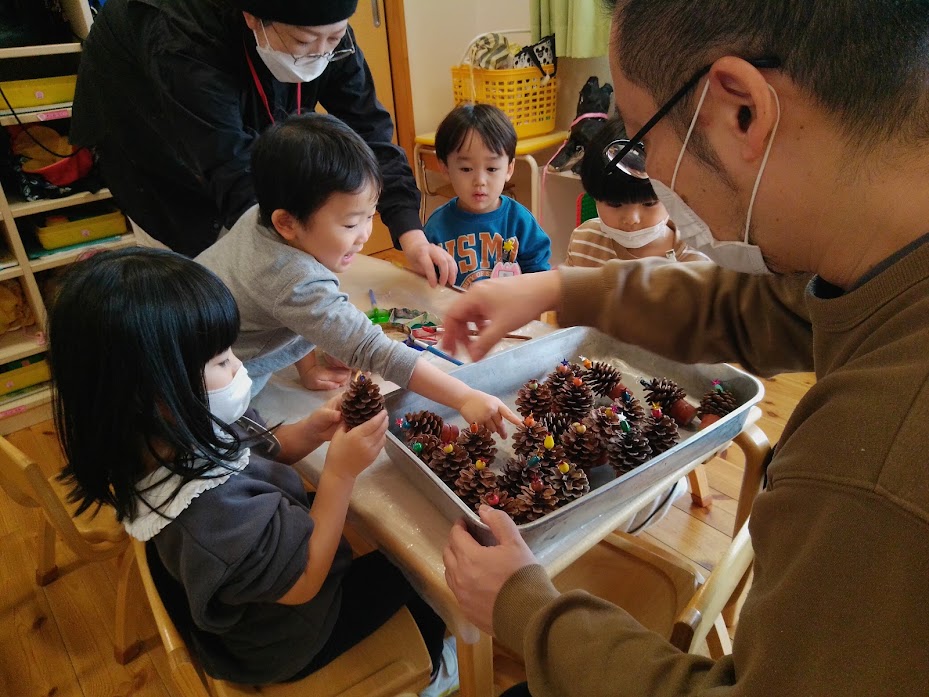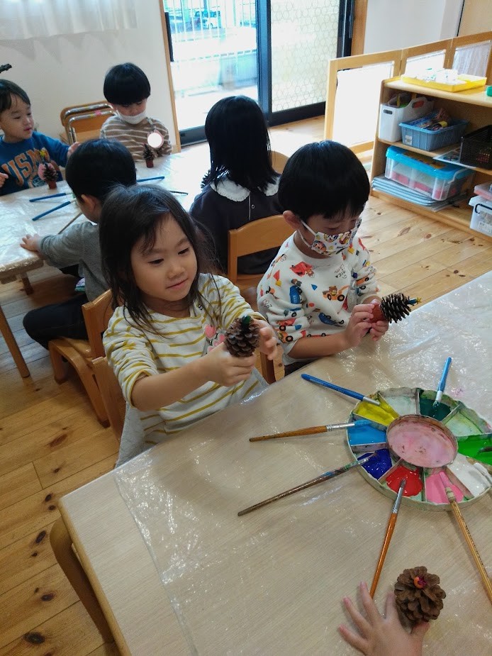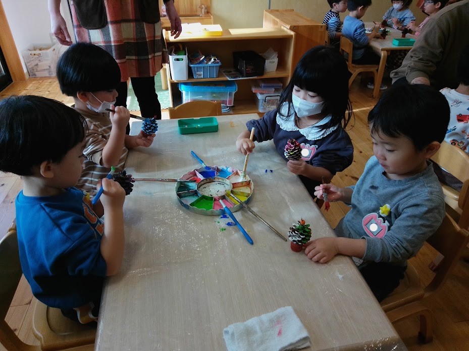 講師の先生が来てくれて、”まつぼっくりのクリスマスツリー”を作りました✨
