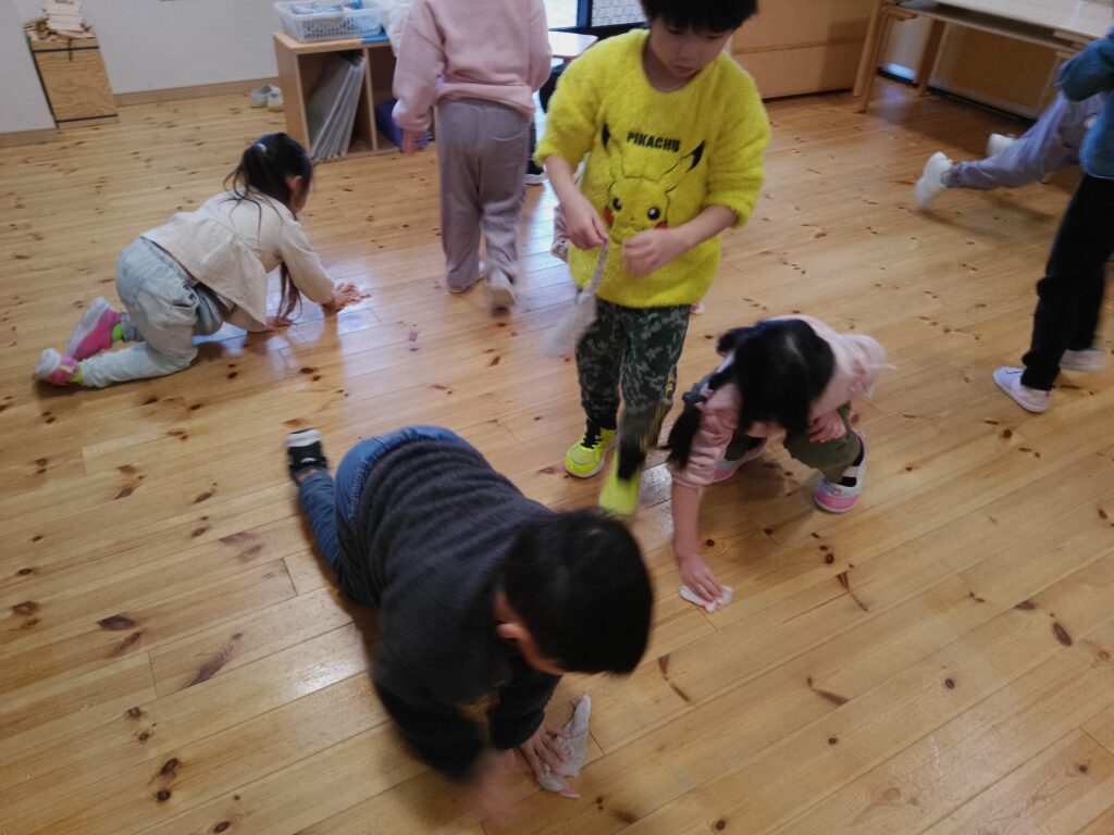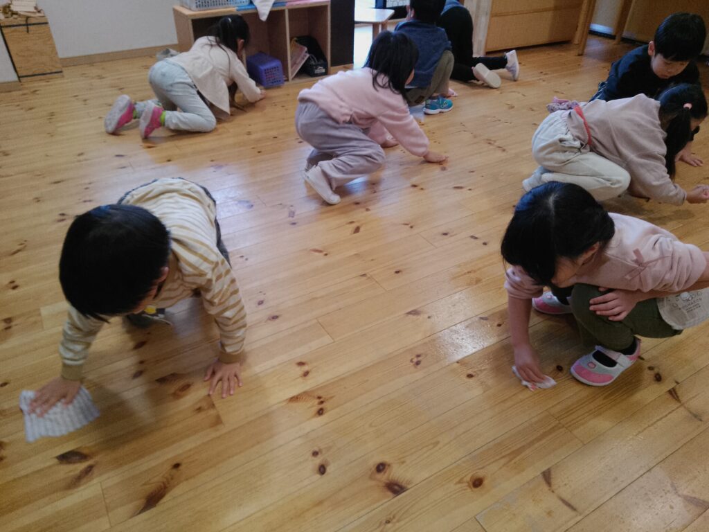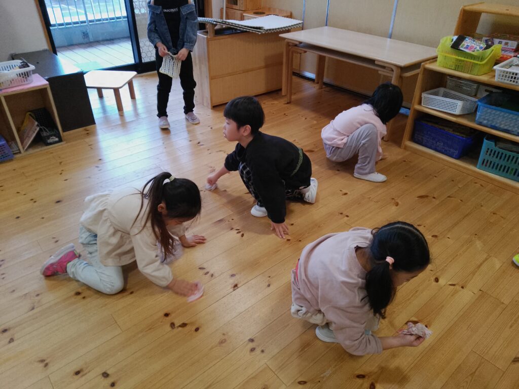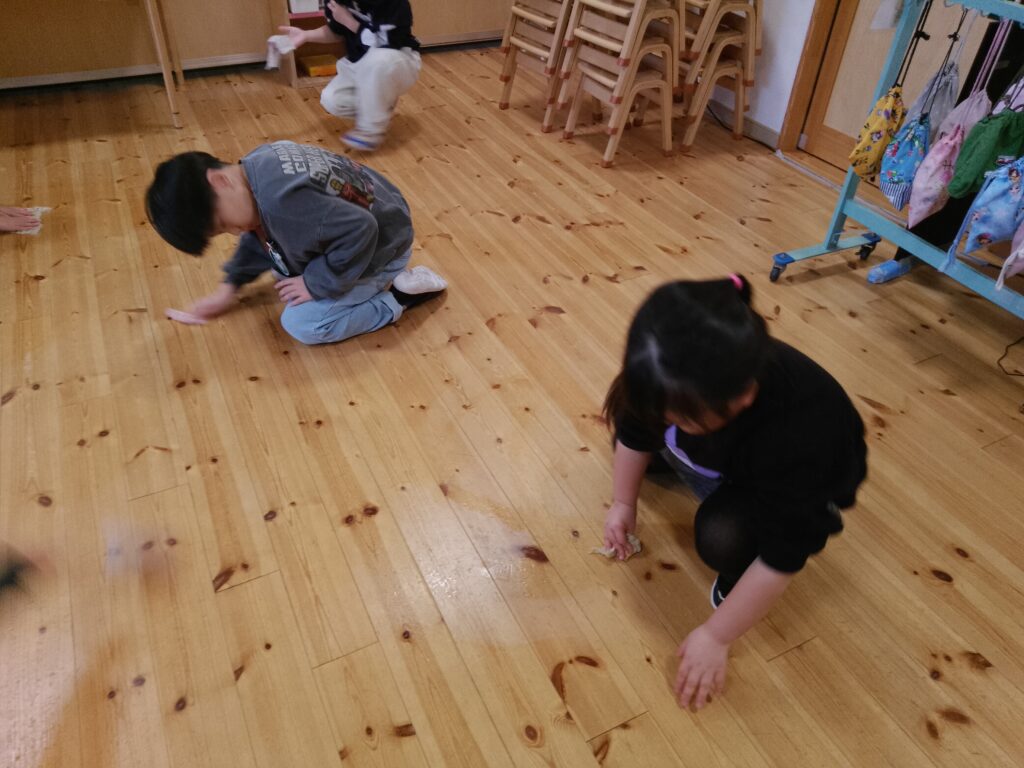 床の汚れも丁寧に拭き進めていました!「ここは?」「この棚も拭いていいの?」と自分たちから意欲的に動く姿が見られましたよ!