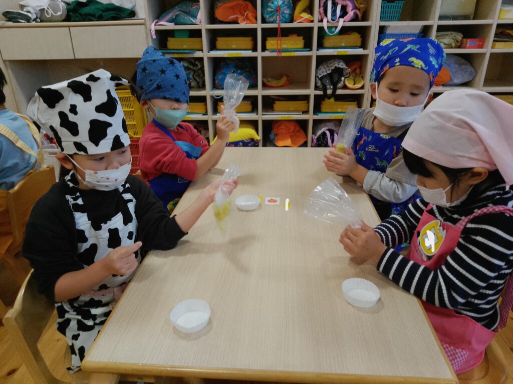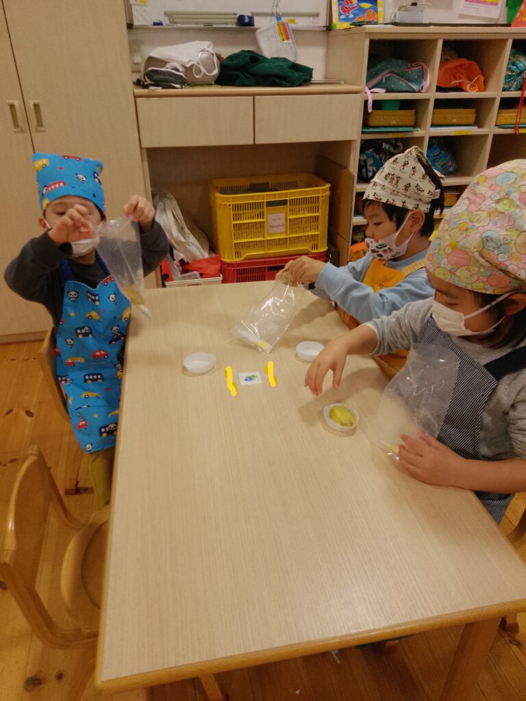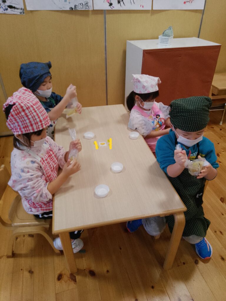 袋の中には砂糖とバターが入っています。おいもは自分で入れます。「いいにおいがする。」