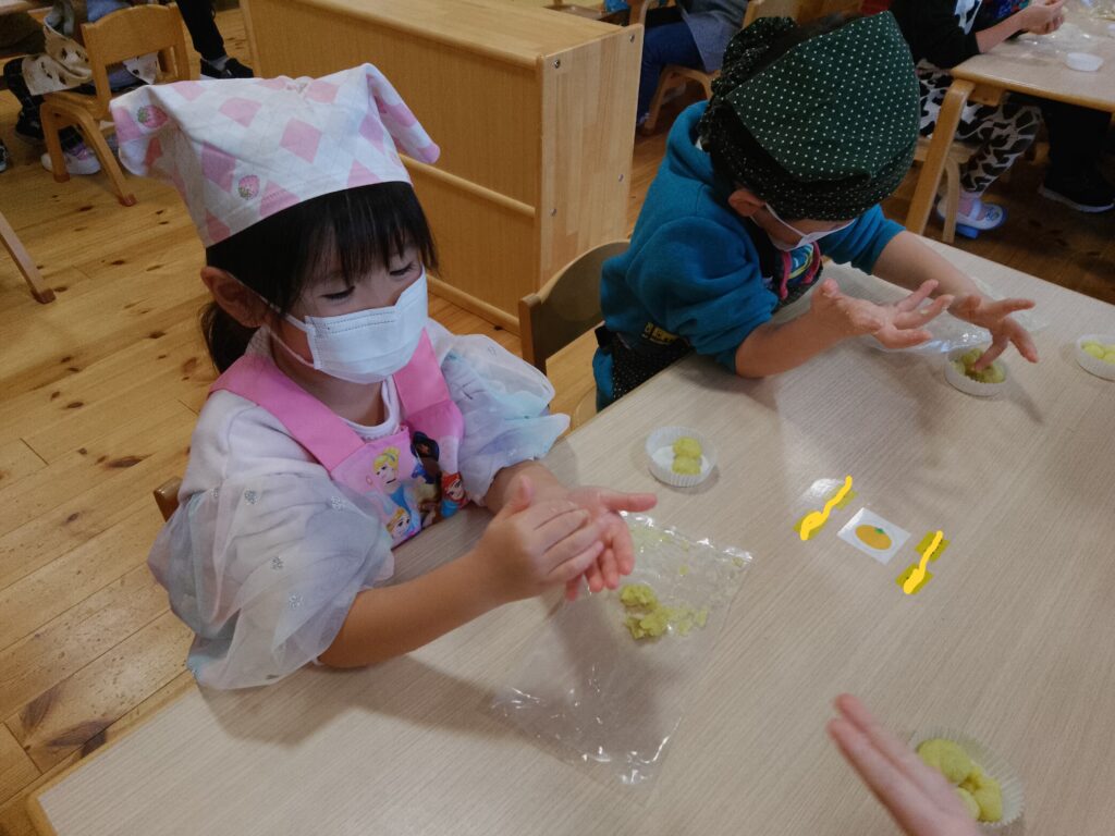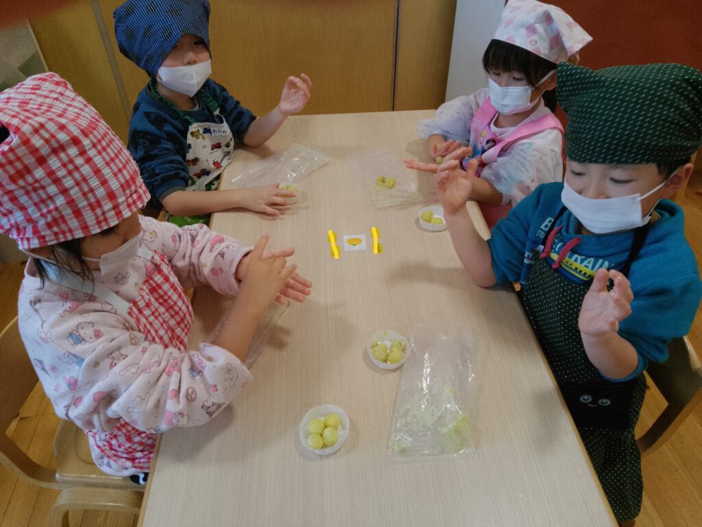 園庭の畑で育てたさつまいも。秋に芋ほりをしたものを使って、スイートポテト作りをしました。