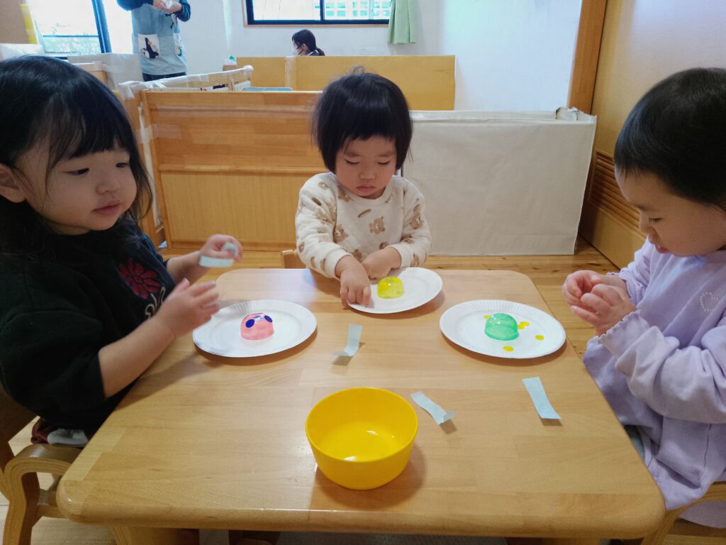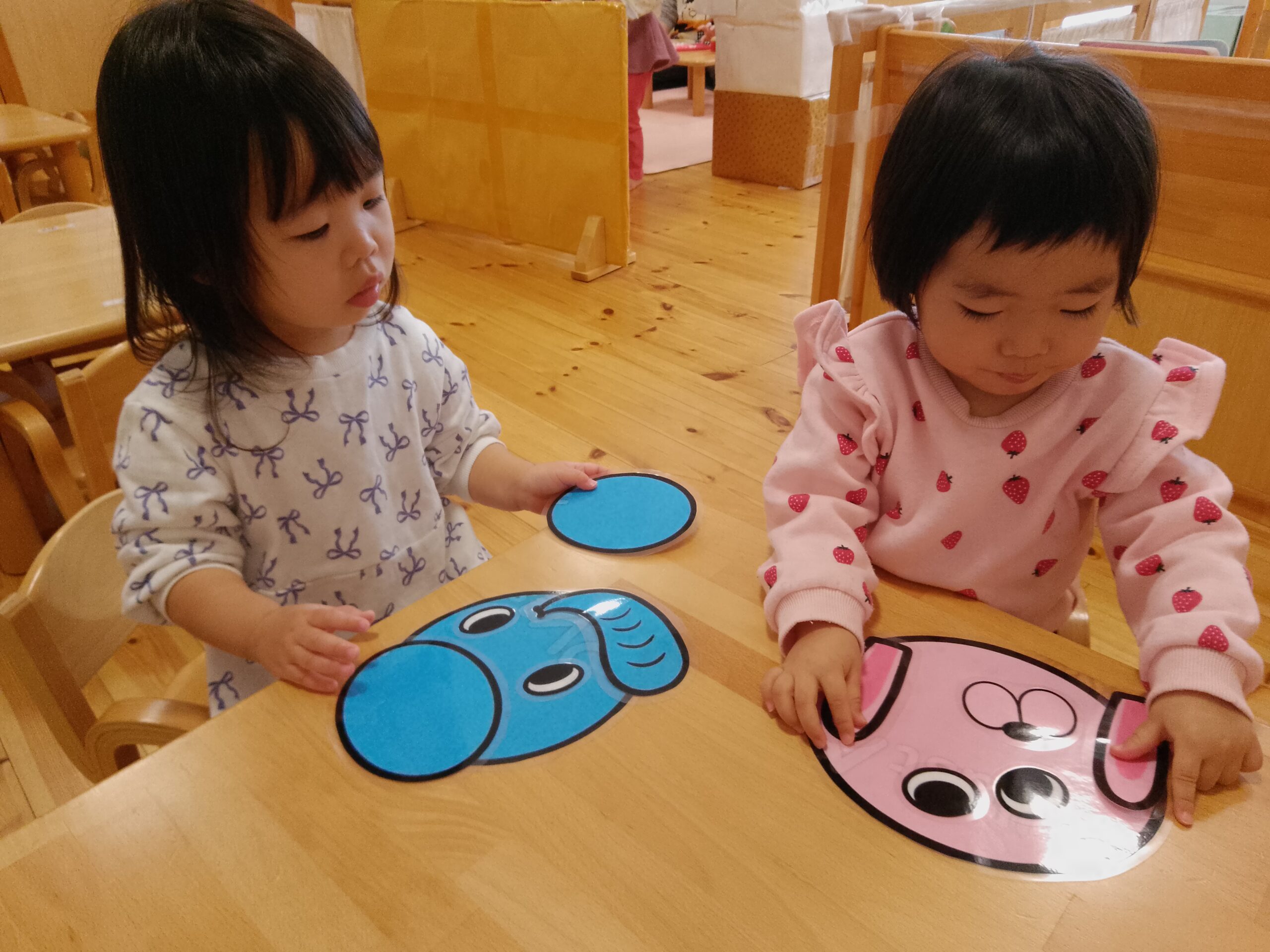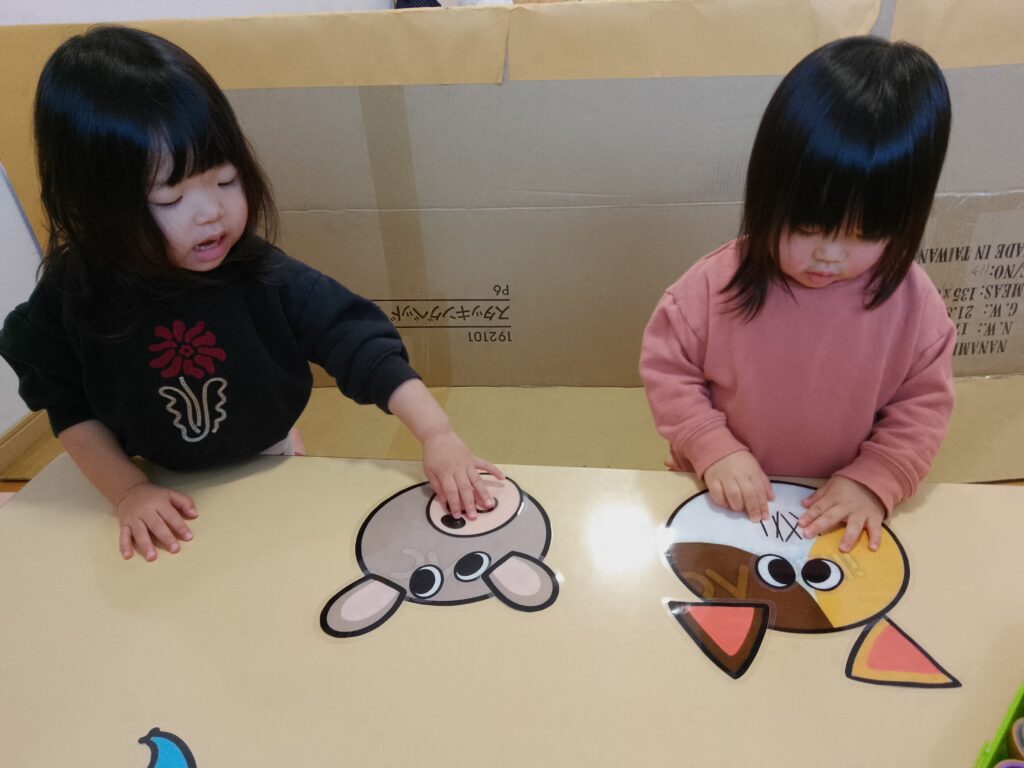 目が上を向いていたり耳が顔の中についていたりと、いろいろな顔の動物が完成し、そばで見ている保育者も笑わせてもらいました。