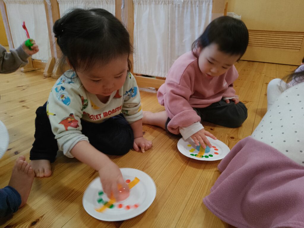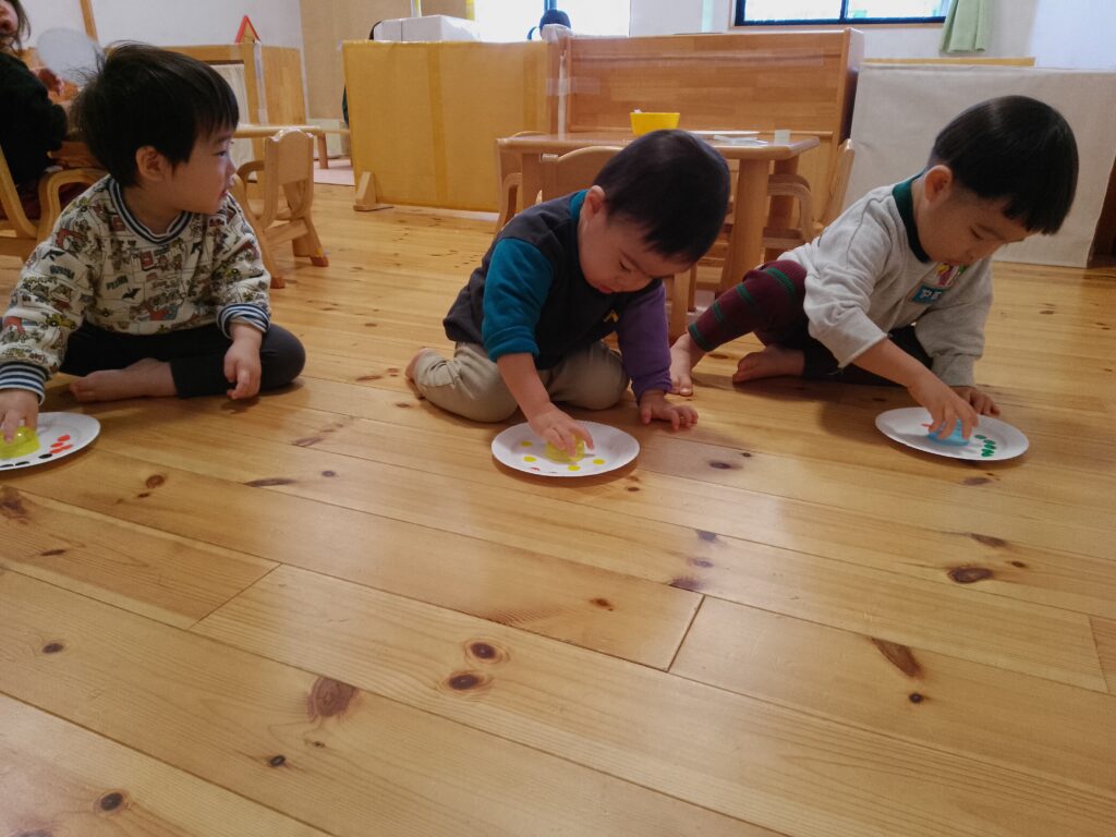 年明けは、手作りのコマや福笑いなどをして正月遊びを楽しみました!