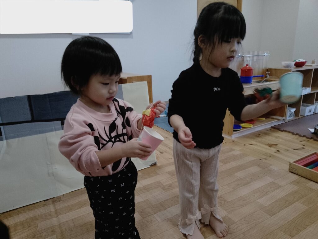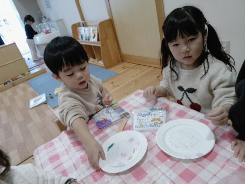 手作りのけん玉とコマを作って遊びました。けん玉は紙コップにペンを使って自由に模様や絵を書き、丸めた紙をくっつけた糸を繋いで作りました。コマは紙皿にペンで自由に絵を書き、中心にキャップをつけて作りました。完成したお正月遊びの玩具は、個性のある素敵な仕上がりとなり、何度もくり返し遊んでいた子どもたちでした。