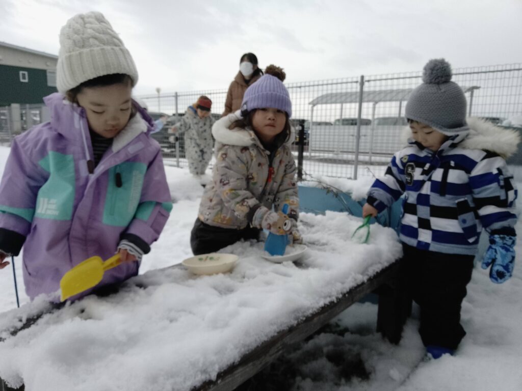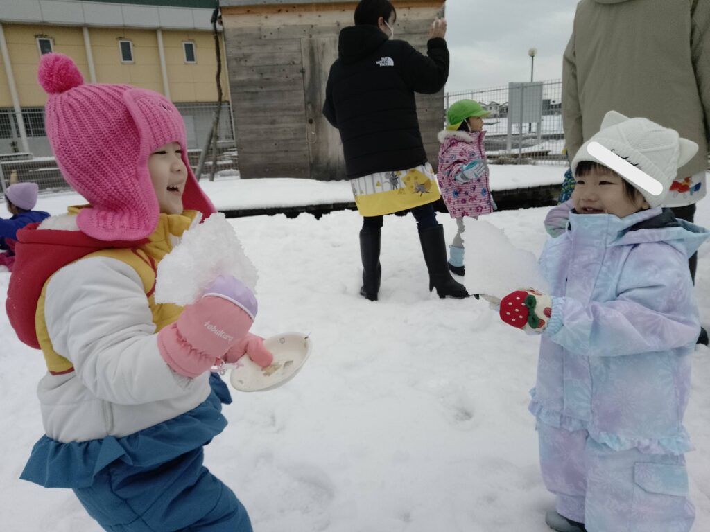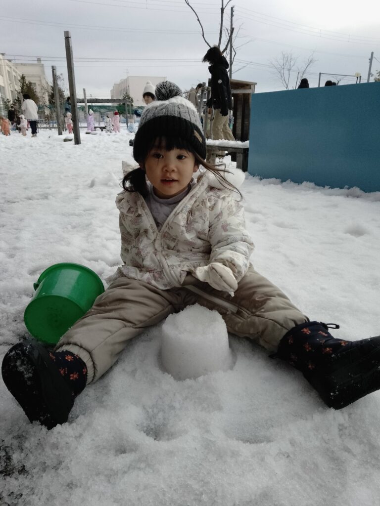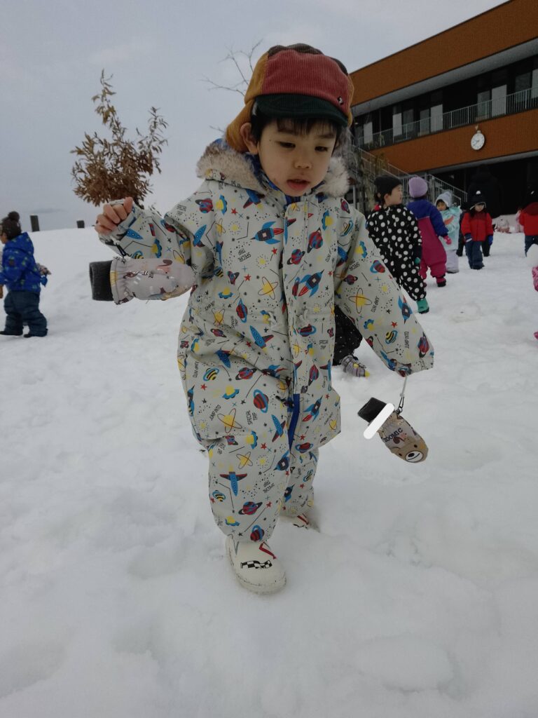 雪が降るたびに窓の外を眺めては、雪遊びが出来ることを待ち遠しそうにしていた子どもたち。今月に入り、雪が降る量も増え、園庭には沢山の雪が積もりました。雪遊びが出来ることを聞いた子どもたちは大喜びしていました!