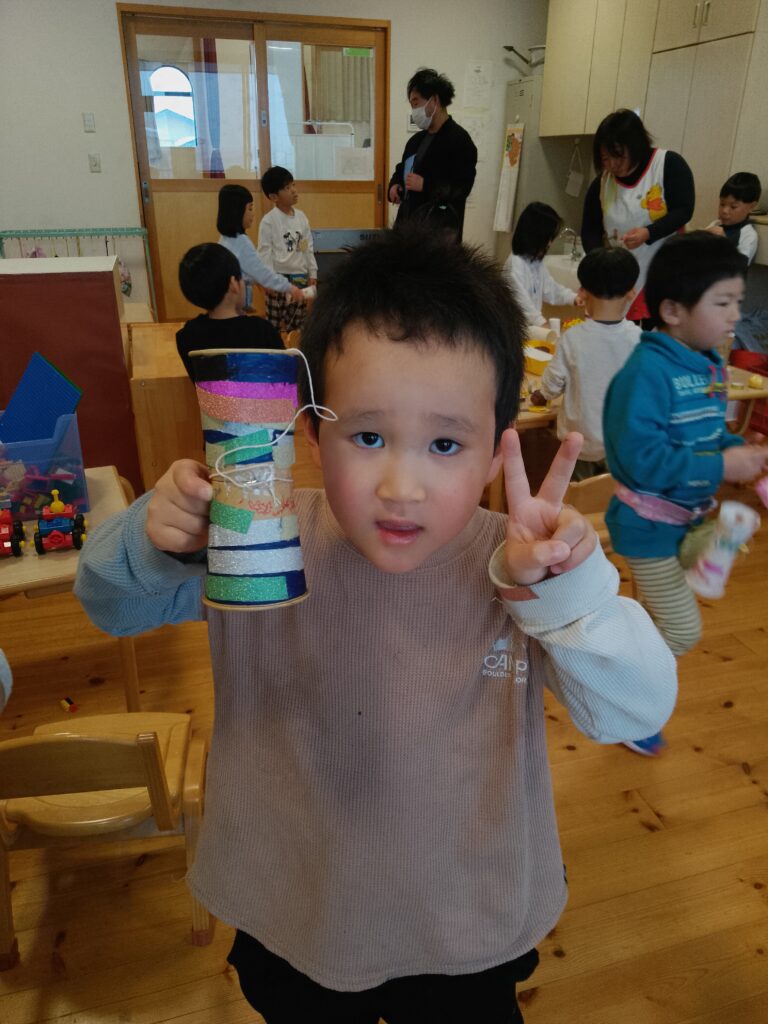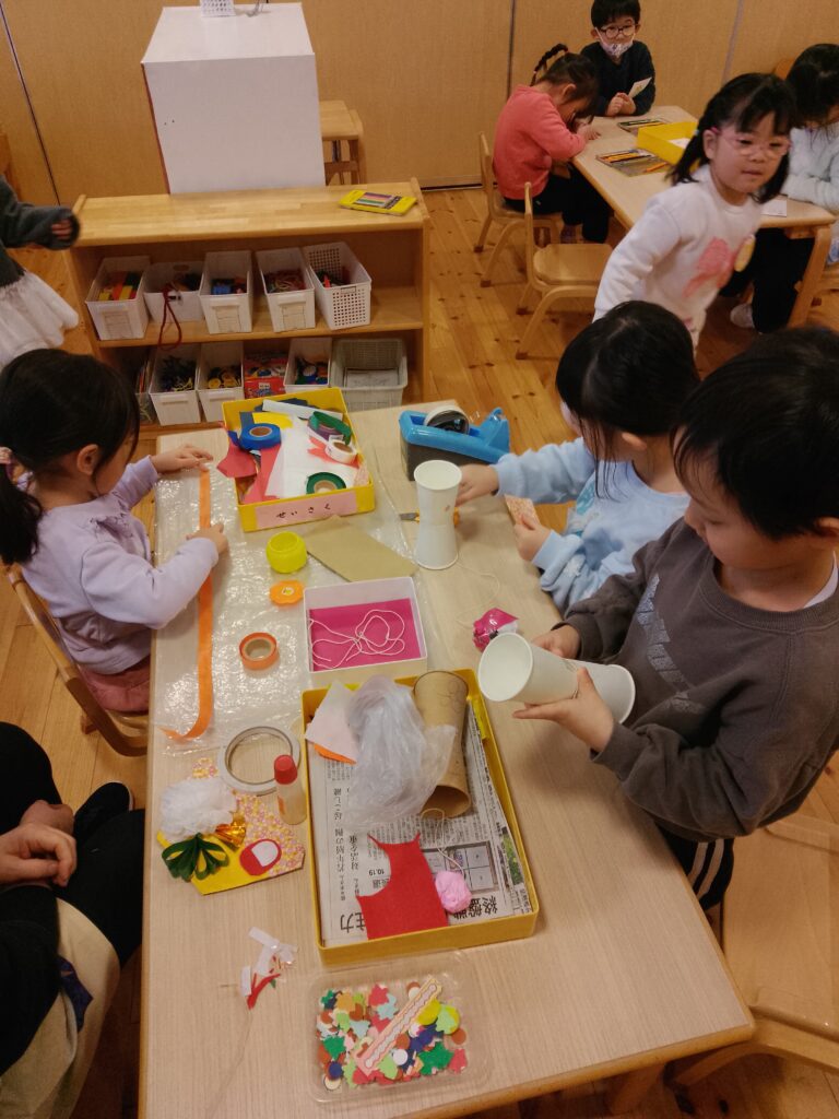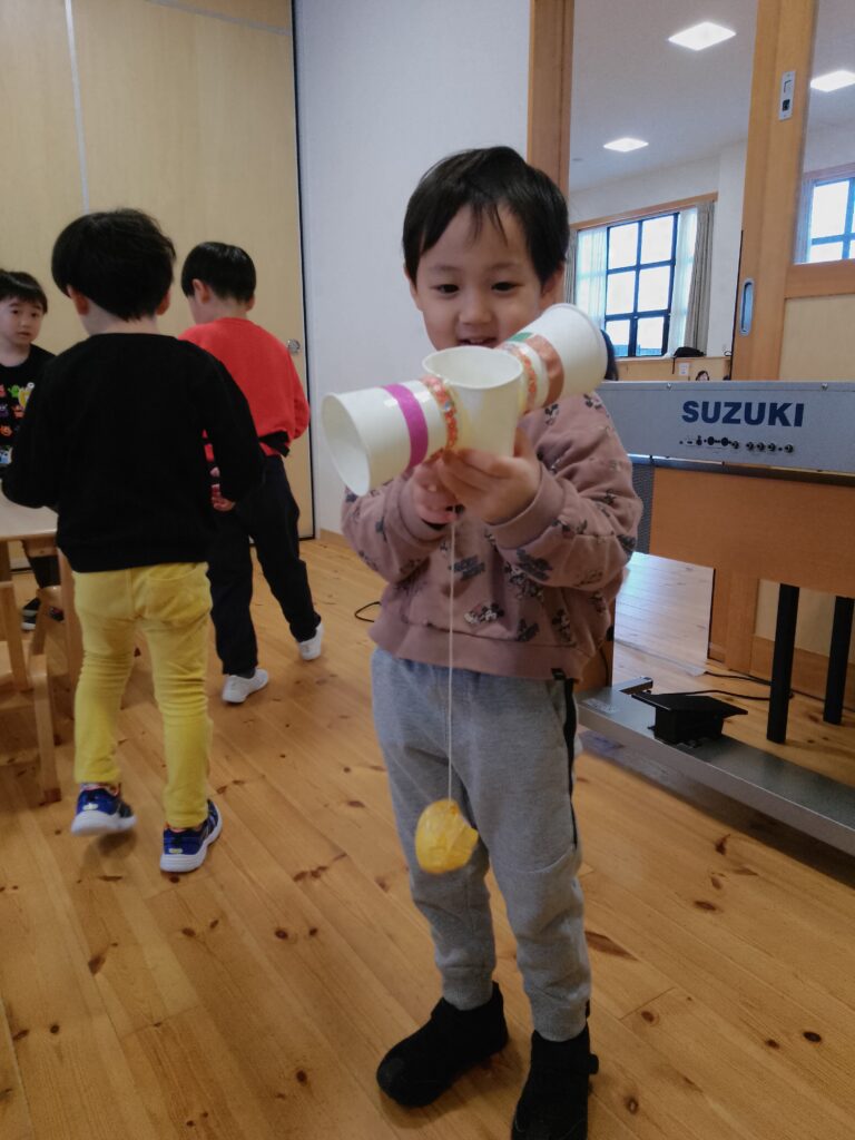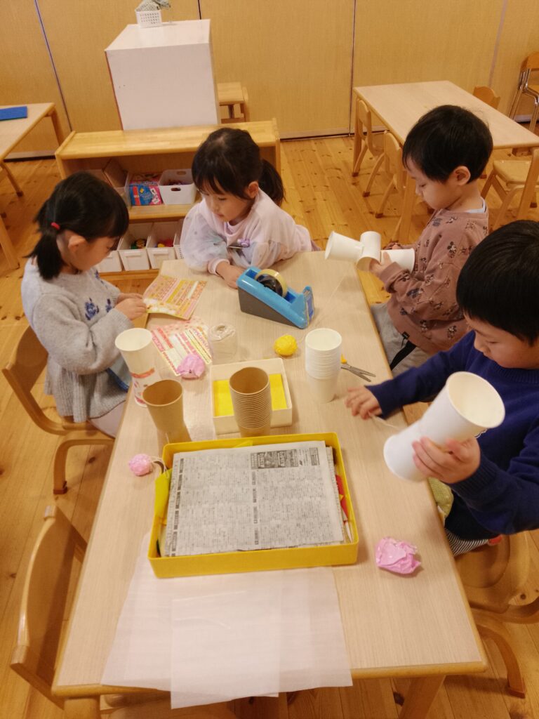 その他にも「けん玉作りたい。」という子がいたので紙コップなど材料を用意すると「私も、ぼくも」とけん玉作りをする子がたくさんいました。
