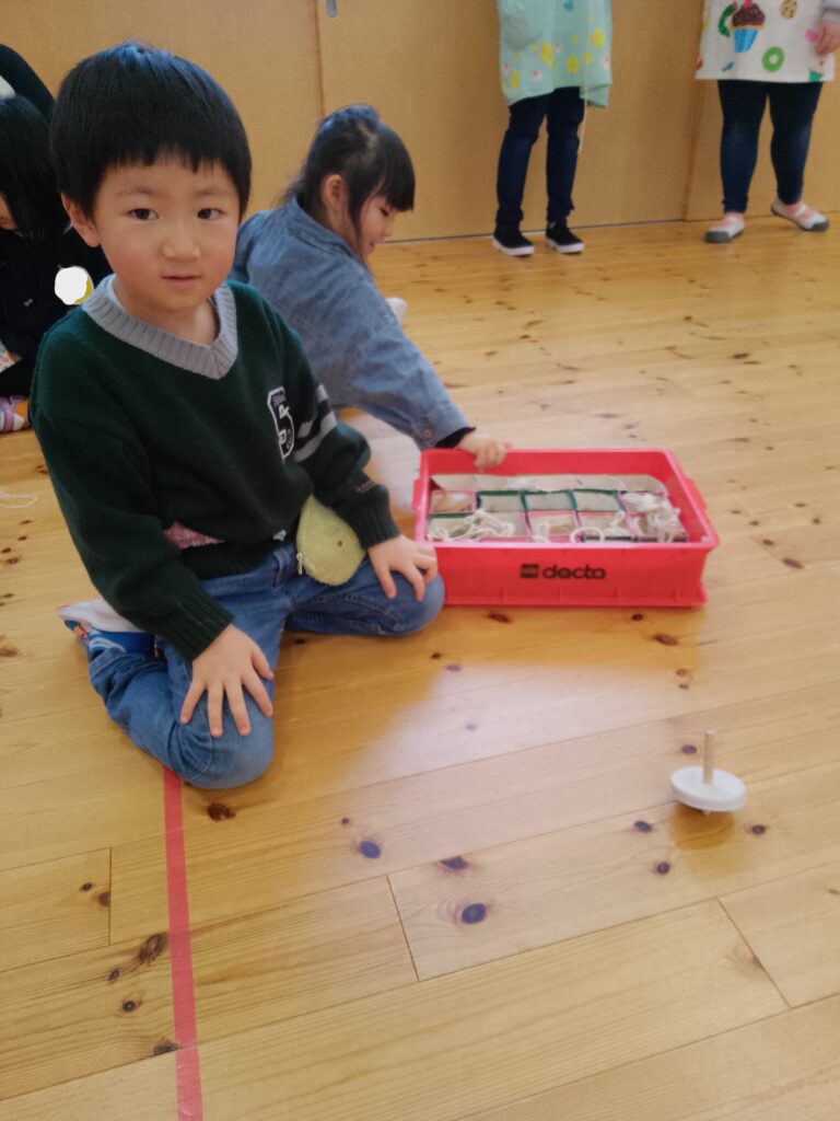 コマは手回しごま、糸引きごま、太めのひもで回すコマと色々なコマに挑戦。最初は回らなかった子も練習して回せるようになりました。