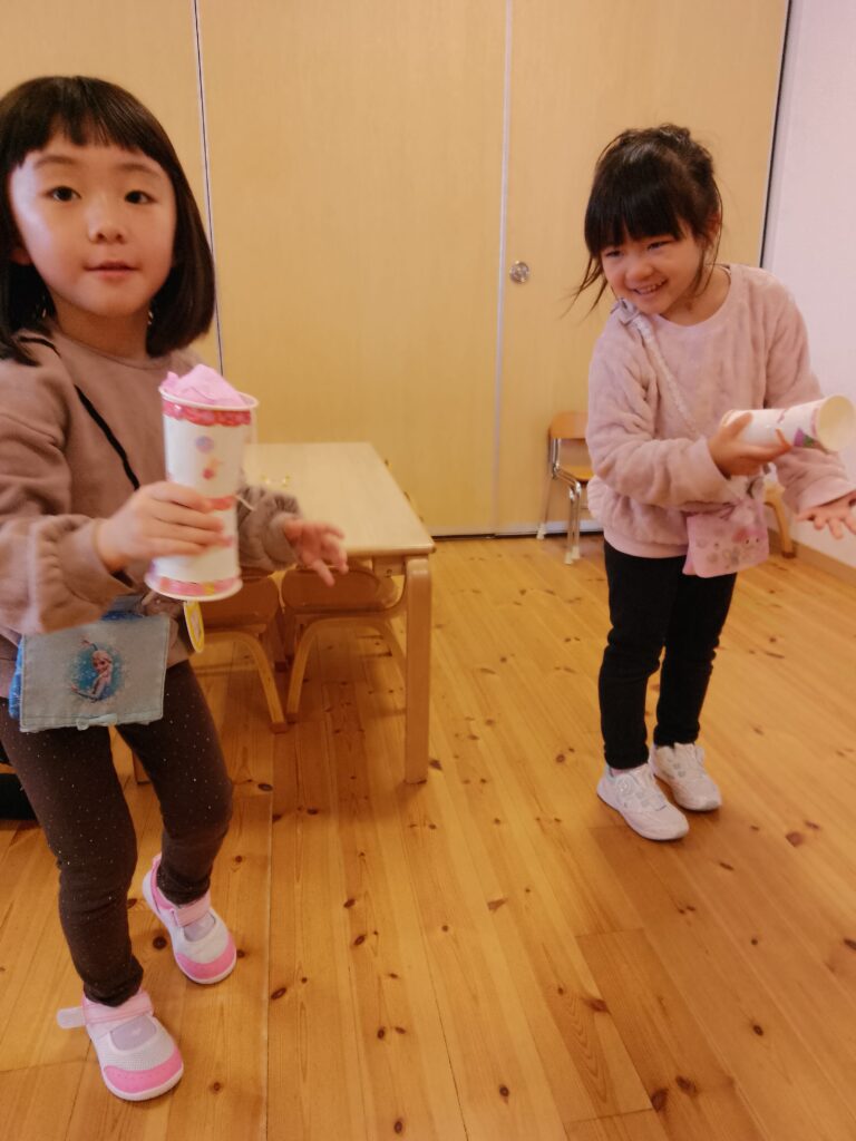 最初は玉がカップに入らなかった子も練習すると「入ったよ!」と嬉しそうん見せてくれるようになりました。