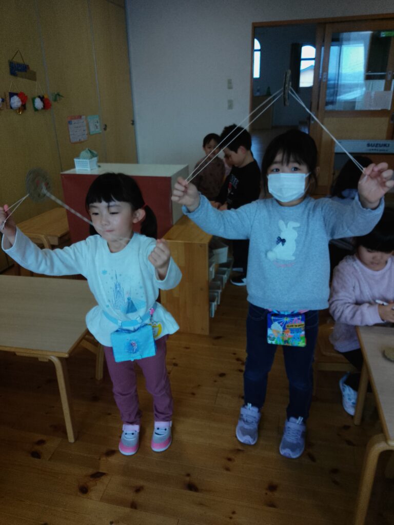 2組さんが作っていたブンブンごまにも興味を持ち、「つくりたーい!」と言うので、作ってみました。