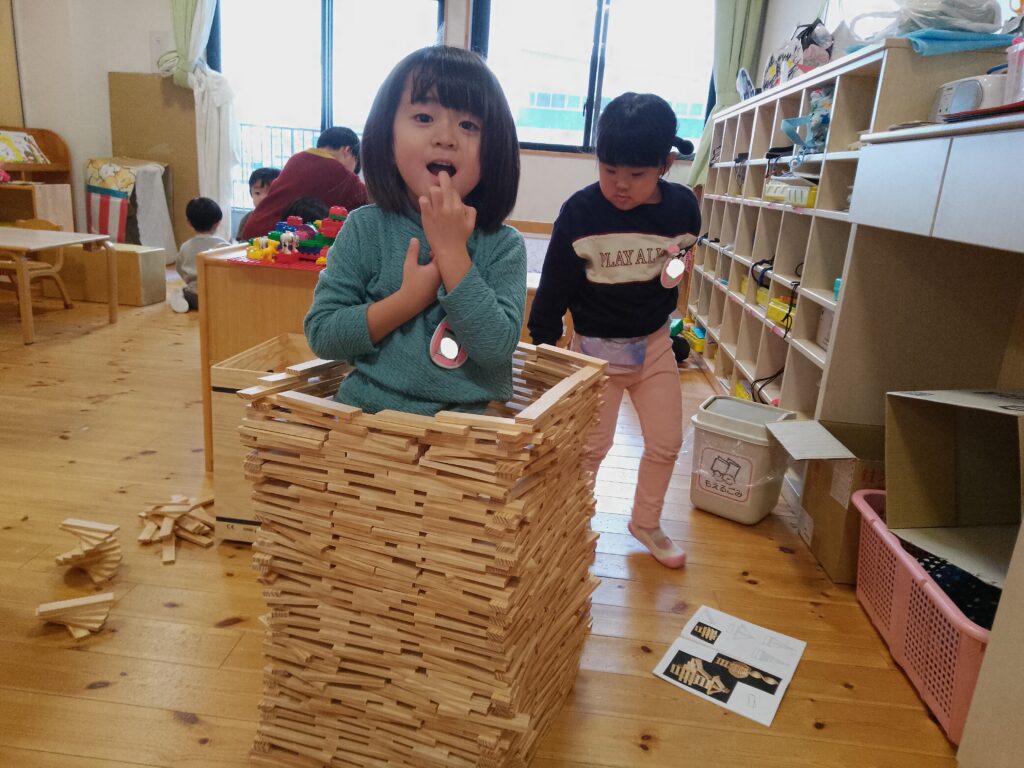 「倒れないね、レンガのおうちみたい!」などと想像を膨らませながら楽しんでいます!