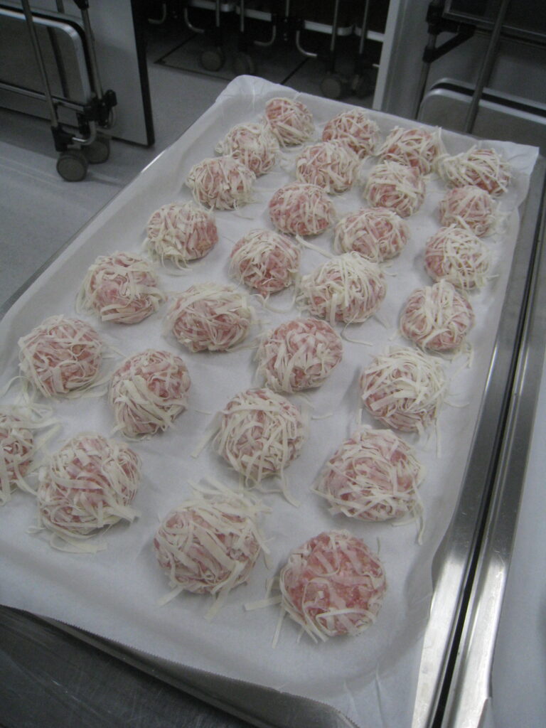 豚のひき肉を7.7キロつかい、しっかりとこねて丸めていきます。しゅうまいの皮をまわりにつけて蒸して完成です。