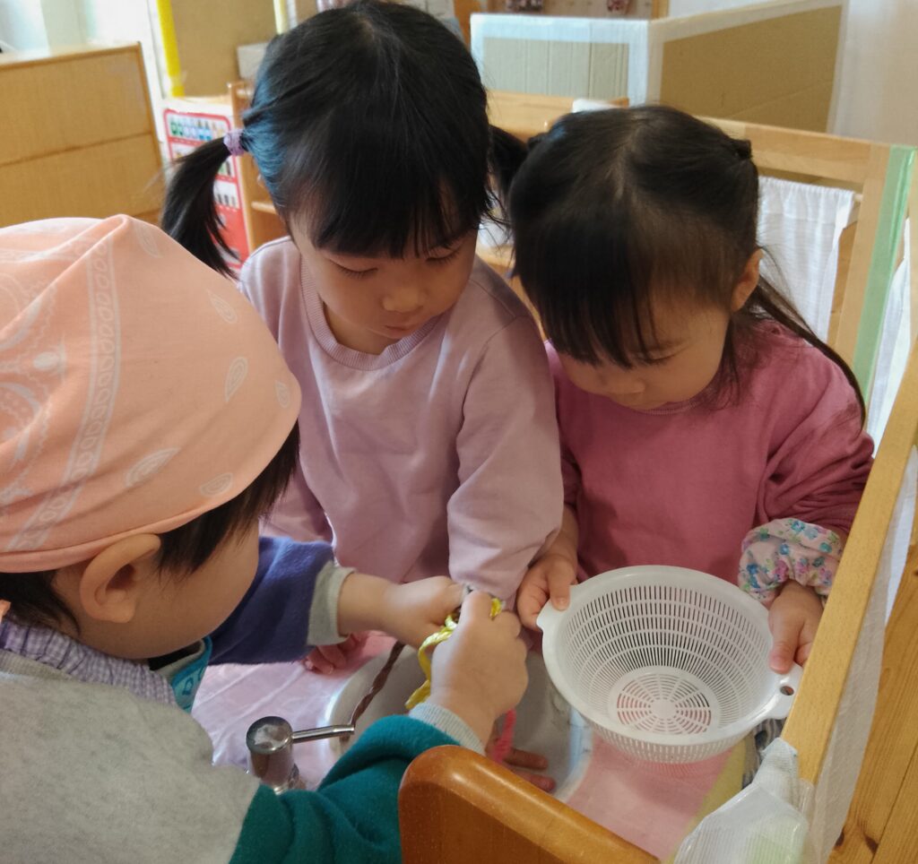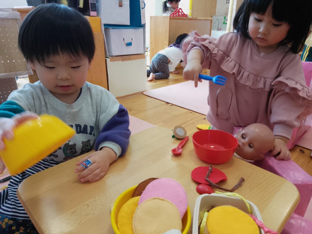 あひる1組のみんなはおままごとが人気で、遊んでいくうちに料理やお世話も上手になっています!