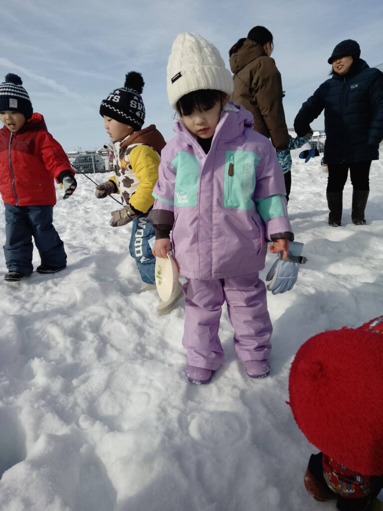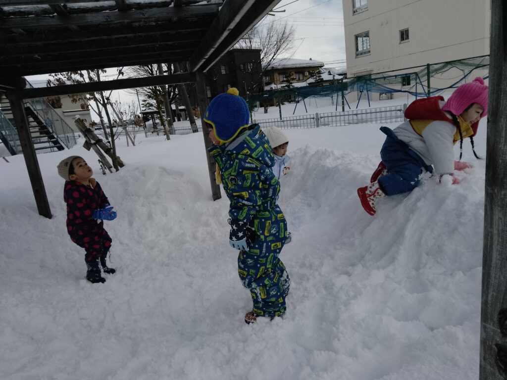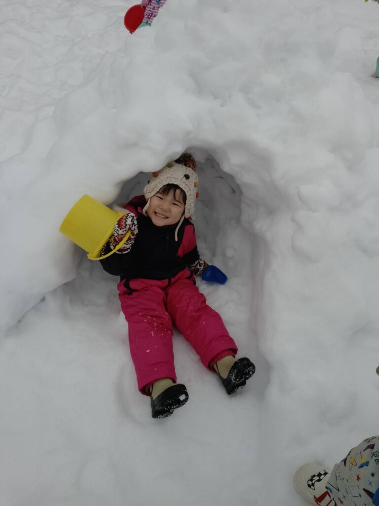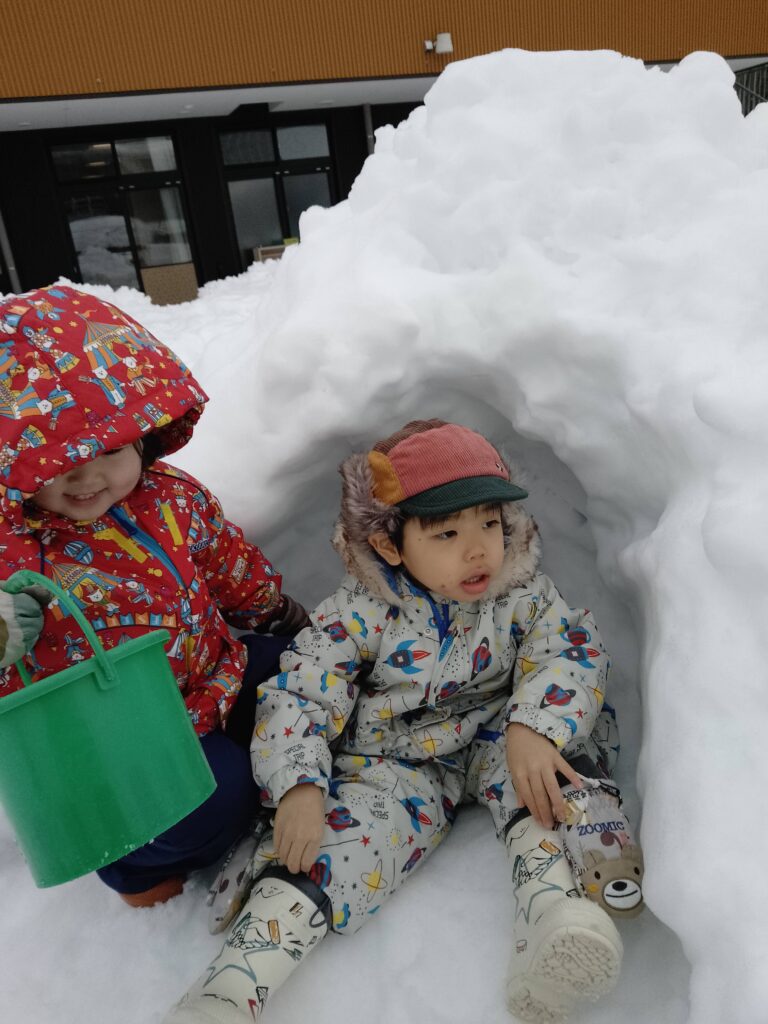お兄さん、お姉さん達がかまくらを作ったようで、「これなぁに?」と子ども達も興味津々!りす1組の子ども達も中に入ってみると、「入れた~」「お家みたい」と嬉しそうでした。